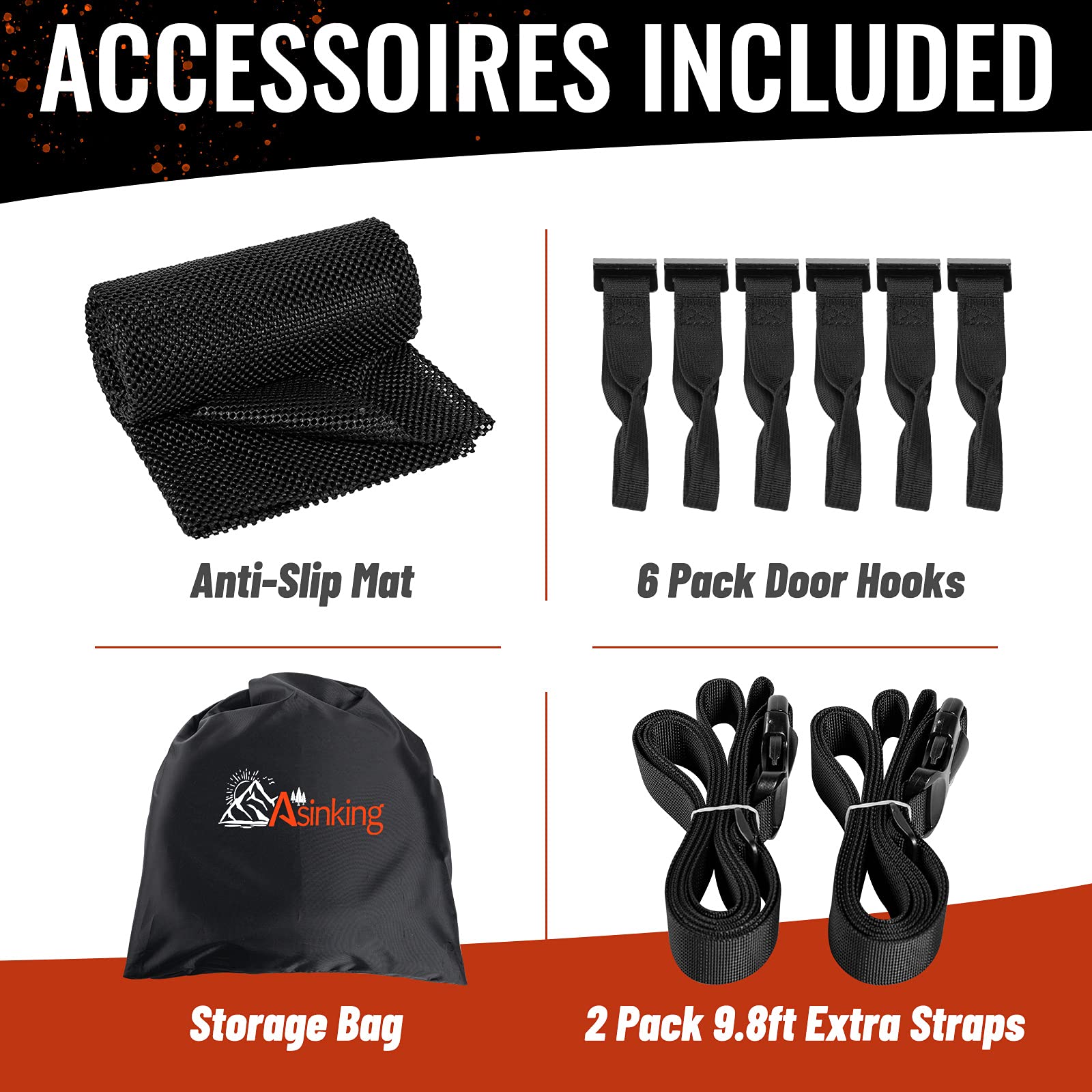 • 【PACKAGE LIST】You will receive 1x roof top carrier bag, 1x storage bag, 1x anti-slip mat, 6x padded door hooks, 2x extra luggage straps, 1x luggage lock.