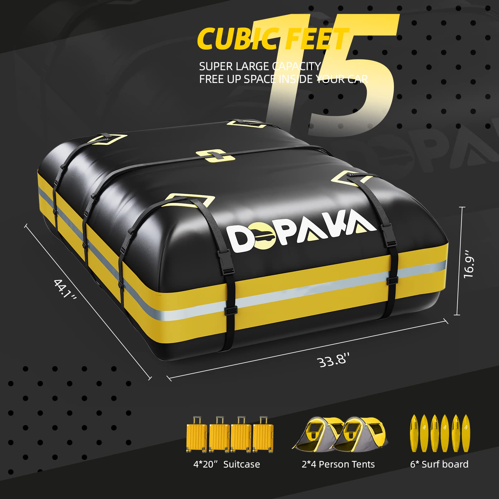 • 【Large Storage Space for Most Families】 If you've ever taken a road trip or driven to your vacation camping destination, you know the importance of waterproof rooftop cargo carrier bag space. Topeka 15 cubic soft roof rack cargo carrier bag 44.1 '(L) x 33.8' (W)x 16.9'(H) allows holding 6 suitcases plus other outdoor travel supplies such as sleeping bags, tents, and carry-on bags. carrying all your needs and saving more inside vehicle space for a more comfortable road trip.