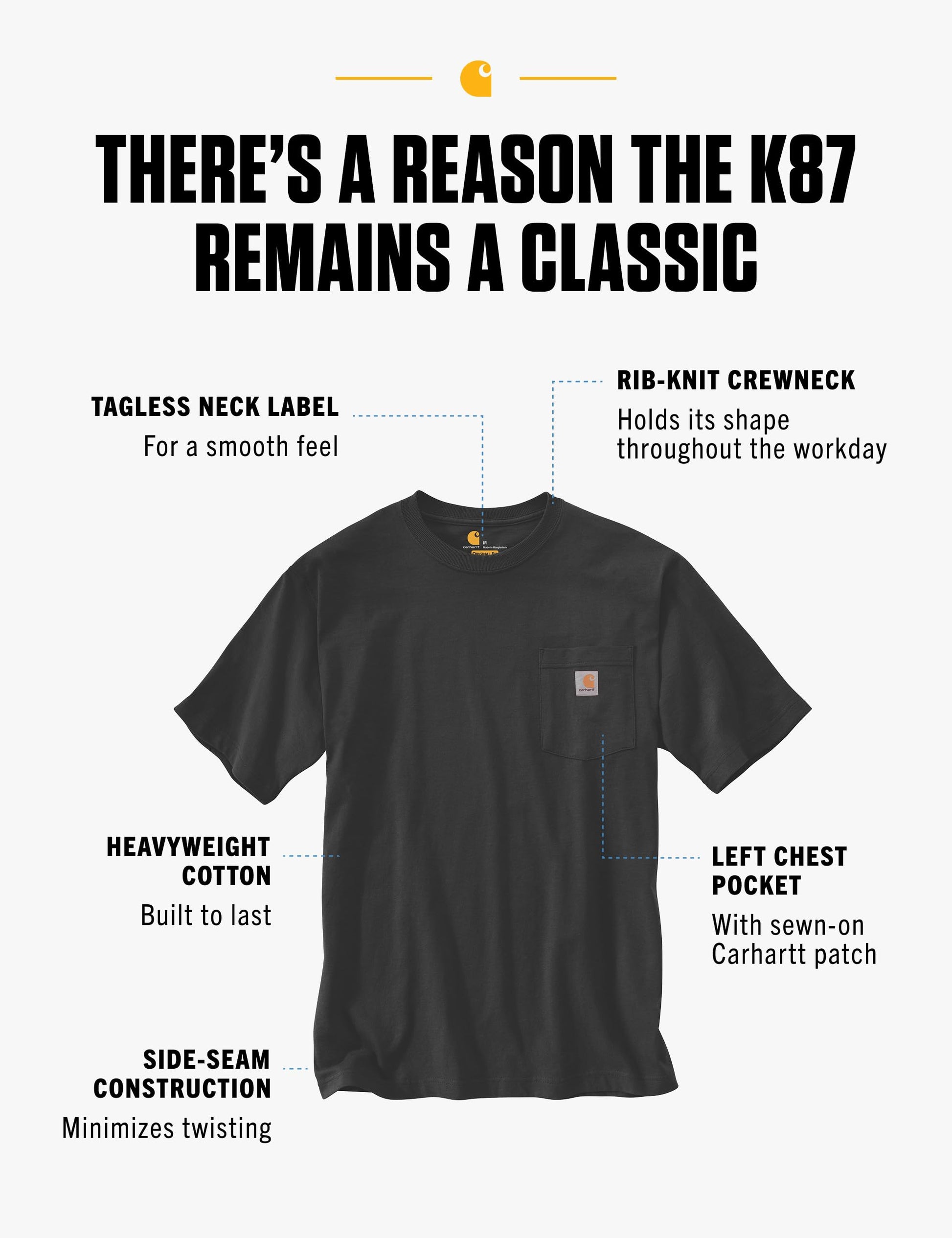 Elevate your everyday essentials with our K87 Men's Heavyweight Crewneck T-Shirt, the perfect blend of comfort, style, durability and safety. Made from 100% rugged cotton, this tee offers a soft, breathable feel that keeps you comfy all day long, whether you're at work or enjoying casual downtime. Designed with a loose fit it provides a boxy silhouette that ensures both style and freedom of movement. This plain, basic t-shirt features a front pocket, adorned with our iconic patch, for added convenience and practicality. Its heavyweight construction delivers a thick, quality fabric that was built to handle tough conditions, making it ideal for work or outdoor activities. The soft cotton keeps you cool and comfortable, while the loose fit makes it a versatile choice for any occasion. Available in sizes XLT and XL, and a variety of colors including neon high vis, this shirt is perfect for big and tall men who need a more spacious fit. Whether you’re looking for an essential piece for your work wardrobe or a stylish, comfy tee for everyday wear, this t-shirt delivers in both fashion and function. Comfortable, durable, and timeless—the Carhartt K87 is a must-have for every man’s wardrobe.