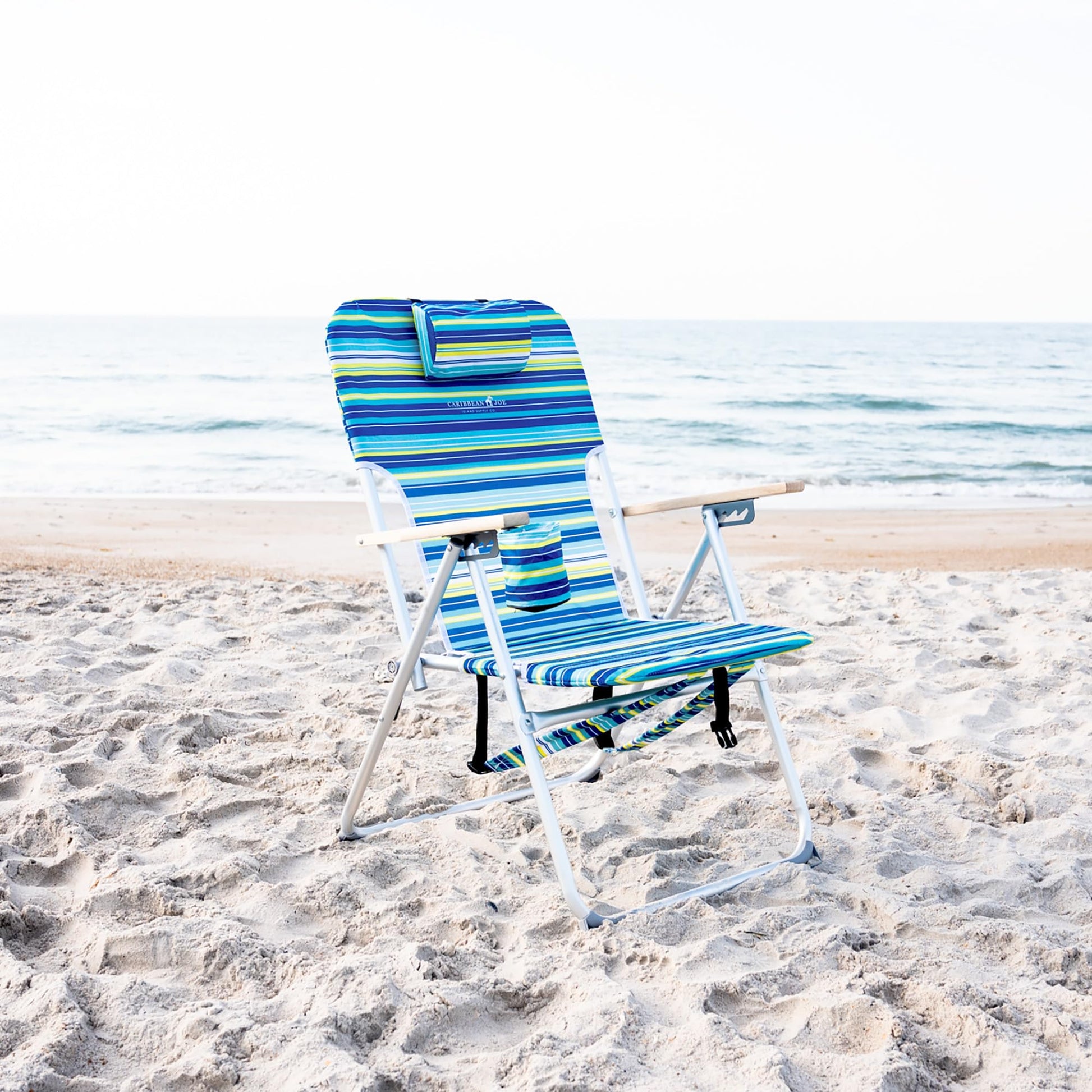 • FOUR POSITION DELUXE BEACH CHAIR: This compact outdoor beach chair with backpack straps and armrests is perfect for sitting back and relaxing on the sand or grass, making it perfect for taking to the beach, park, camp site, or even in your own yard; includes head rest and cup holder, measures 25 W x 23 D x 35.5 H (in inches)