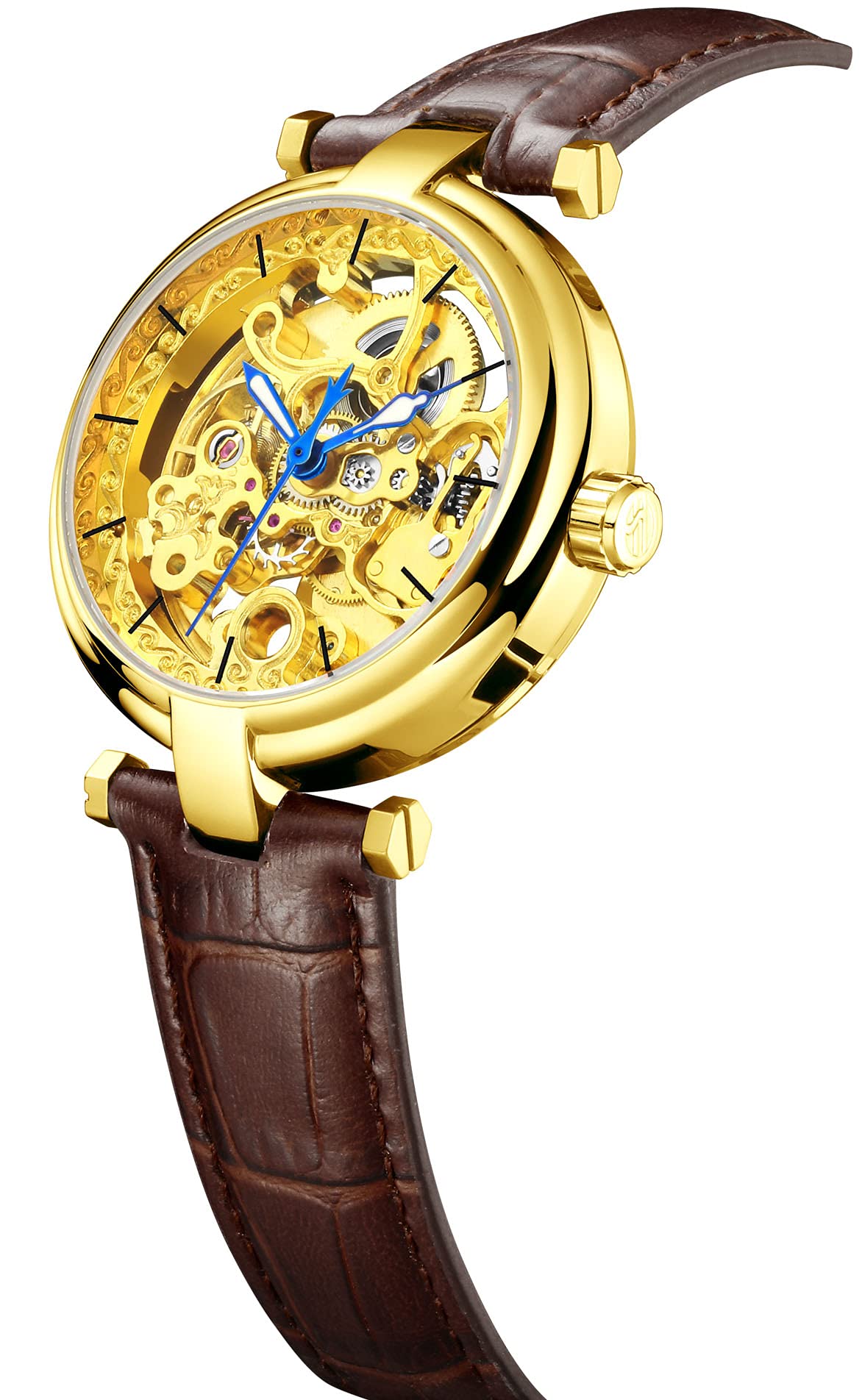 CARLIEN Skeleton Automatic Steampunk Watches Gold-Tone Luminous Hands Leather Strap Wrist-Watch (Gold)