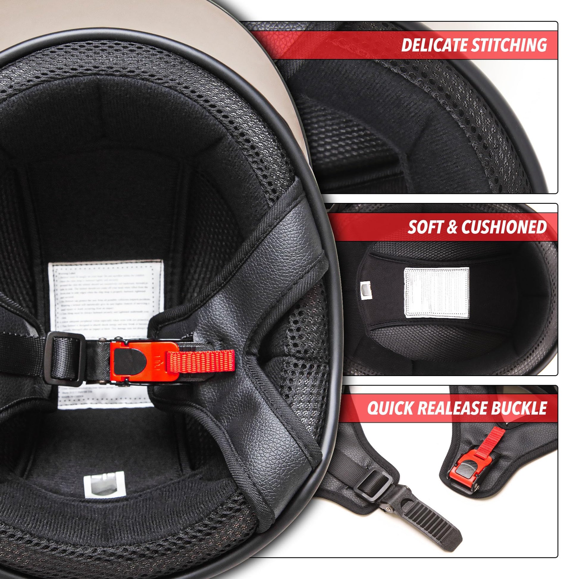 • Quick release buckle allows motorists to quickly take helmet on and off, and also makes it easy to adjust the tightness of the helmet even with gloves.