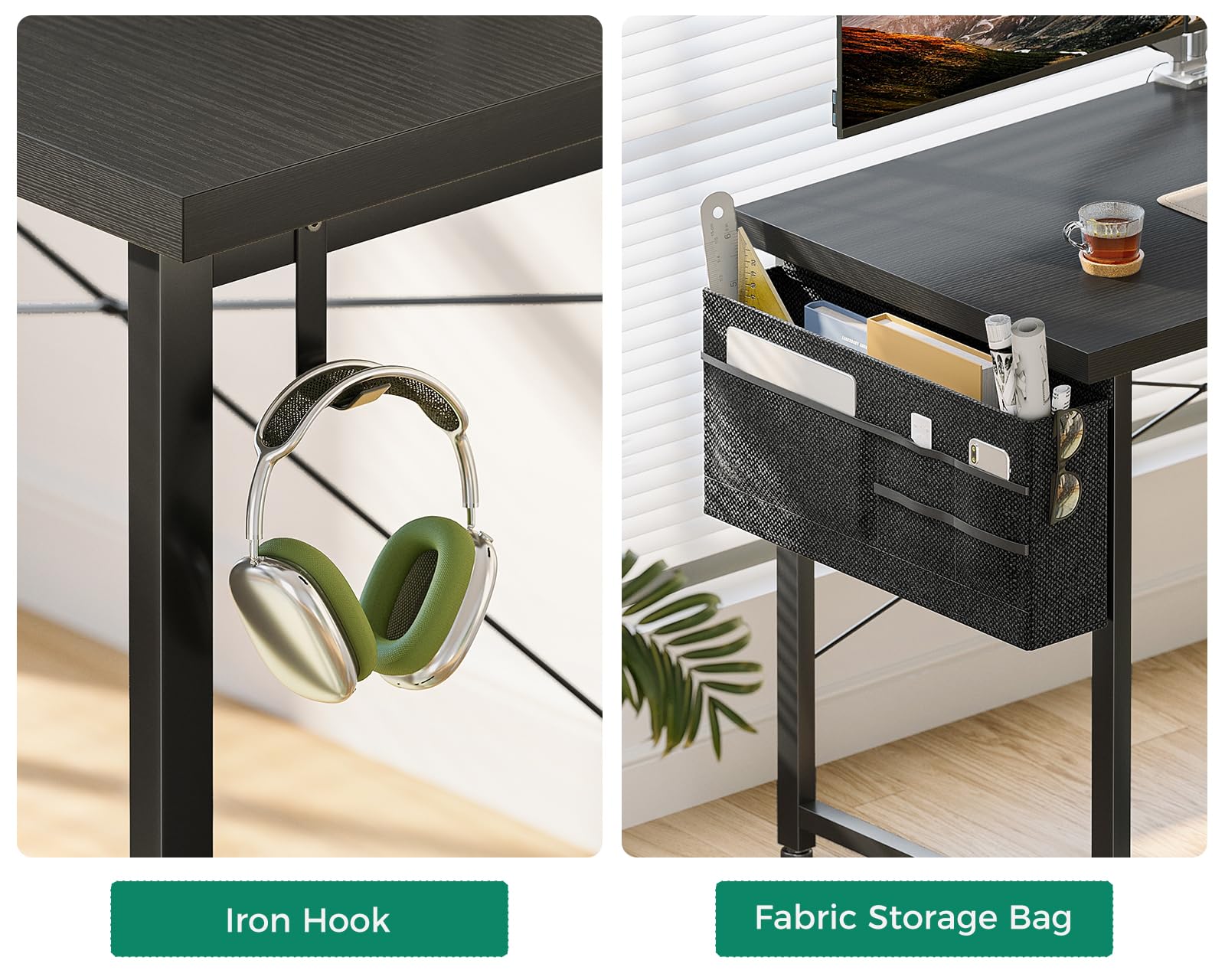 • 【Storage Bag & Iron Hooks】: The l-shaped desk comes equipped with a headphone hook and a fabric bag, allowing you to keep your belongings organized and within reach. Customize their placement according to your working habits for a clutter-free workspace and efficient workflow.