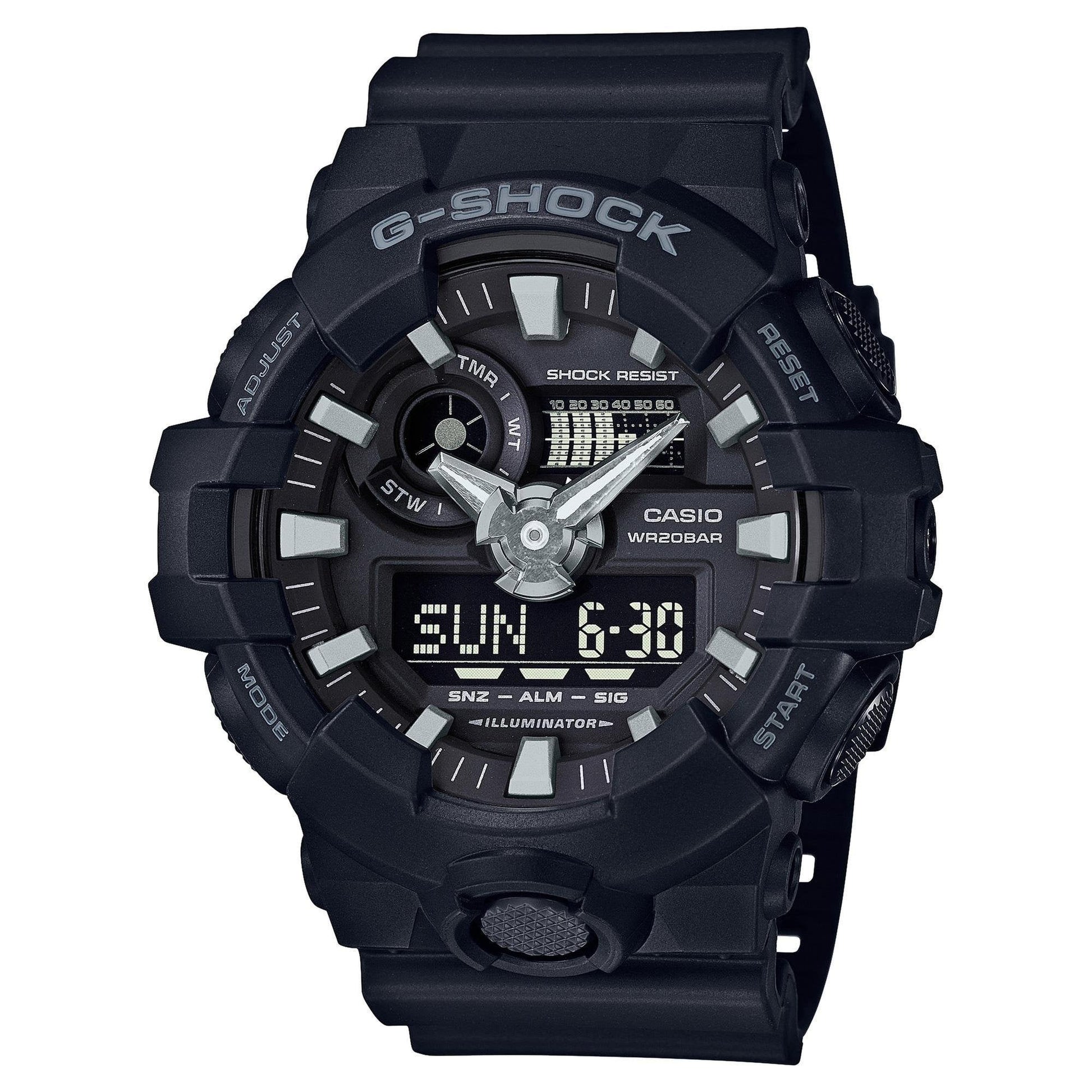 Details: Description Brand Story Casio With the launch of its first watch in November 1974, Casio entered the wristwatch market at a time when the watch industry had just discovered digital technology. As a company with cutting-edge electronic technology developed for pocket calculators, Casio entered this field confident that it could develop timepieces that would lead the market. Today, Casio is focusing its efforts on solar-powered radio-controlled watches: the built-in solar battery eliminates the nuisance of replacing batteries, atomic timekeeping means the users never have to reset the time. Recently, Casio launched a series of Bluetooth watches that sync to the users cell phone to automatically update the time. Casio is always moving time forward. From the Manufacturer From G-SHOCK, the watch brand that is constantly setting new standards for timekeeping toughness comes the GA-700 analog/digital combination model. Multi-dimensional hour and minute hands look as if they were carved out of a piece of metal for a powerful and bold design. The new form of these watches not only improves reading, it also projects a feeling of toughness. A front button at 6 o'clock adds to the dynamic, leading-edge styling. The five color schemes of these models were carefully selected to reflect the brand concept. All the practicality of the analog-digital format, high-brightness LED illumination, a hand shift function and much more all add up to the best in timekeeping convenience. A 3D face combining with a distinctively tough design makes the GA-700 models look dynamic and tough.