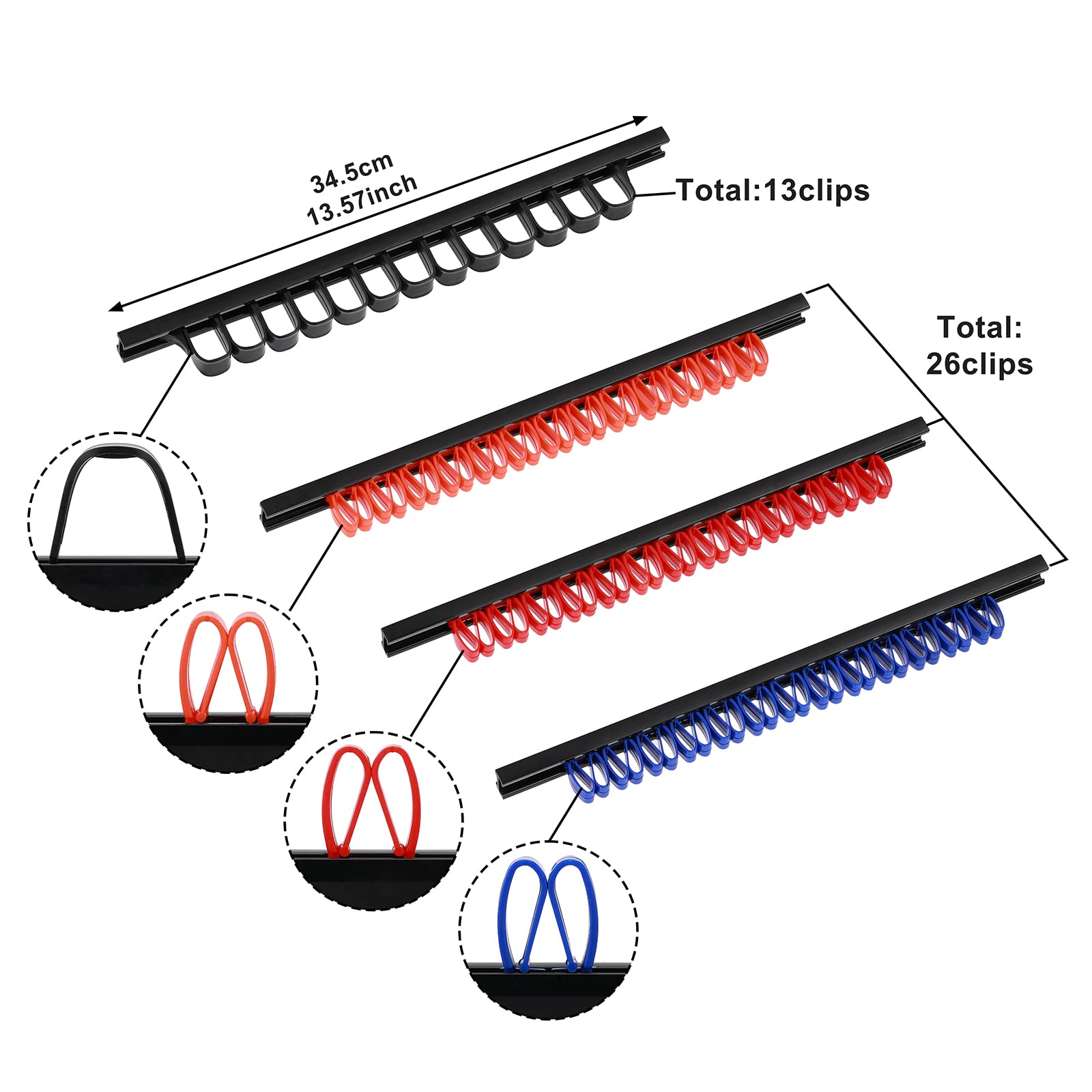 • Set includes 6 pcs screwdriver rails with 13pcs red clips, 13pcs organe clips, 13pcs blue clips and 4 pcs wrench rails with 52pcs black clips