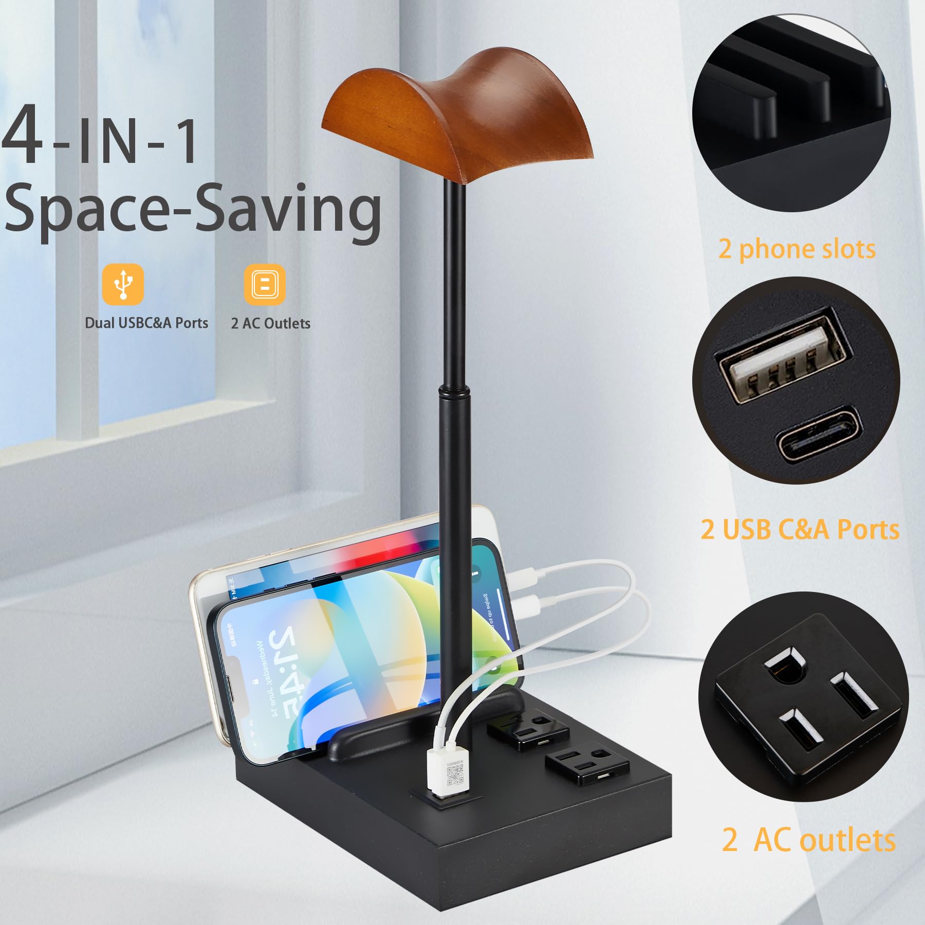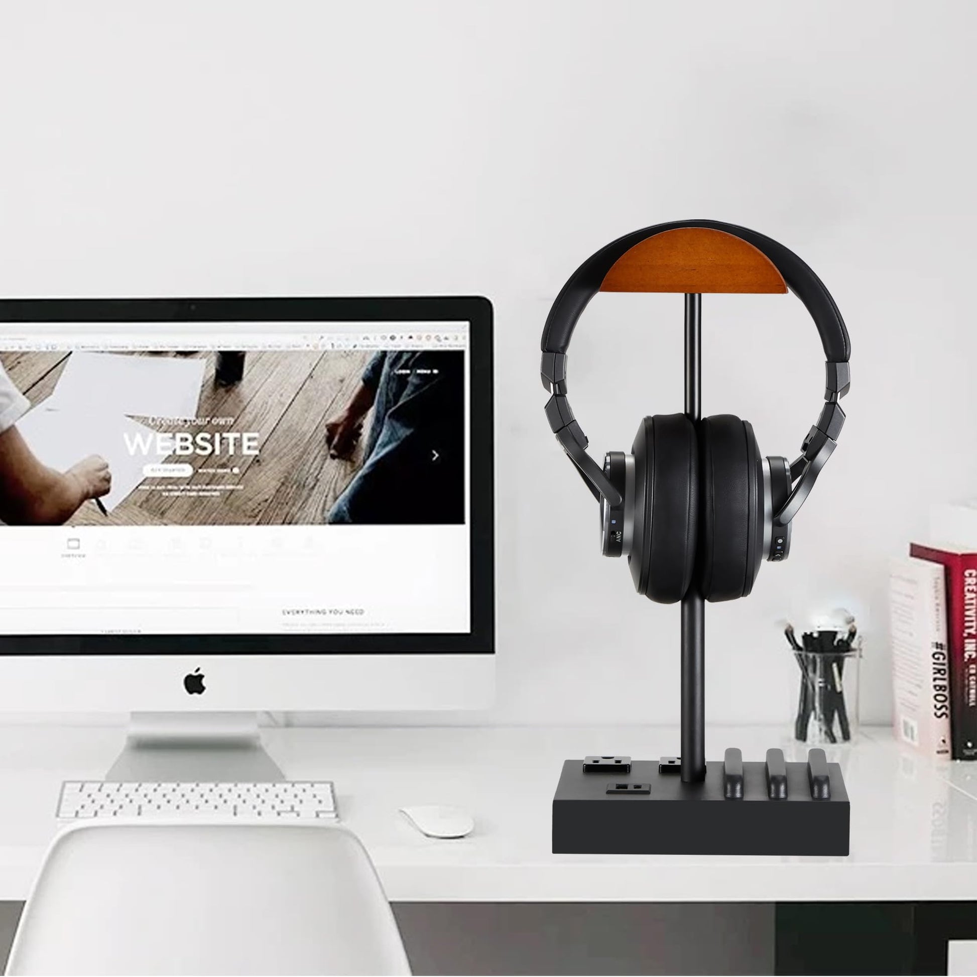 CASTLELIFE Headphone Stand Desktop Gaming Headset Holder with 2 AC Outlets and USB C&A Ports, Charging Station&Phone Stands, Wood Earphone Table Game Accessories for Desktop Gamer, Black