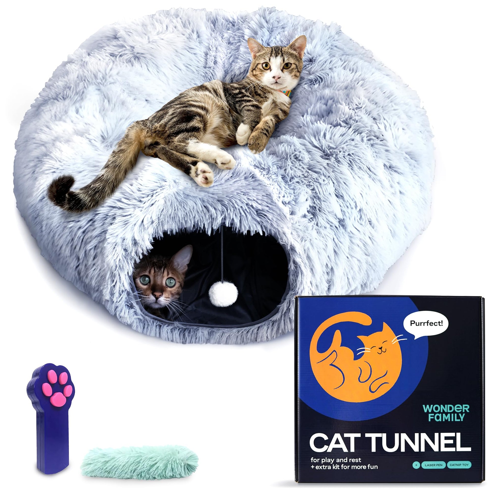 Cat Tunnel Bed with Cat Toys for Bored Indoor Adult Cats – Includes 1 Laser Paw, 1 Ball, and 2 Hollow Tunnels to Form Big Donut Shaped Tube - Can Be Used as Peekabo Cave or Comfy Pet Bed