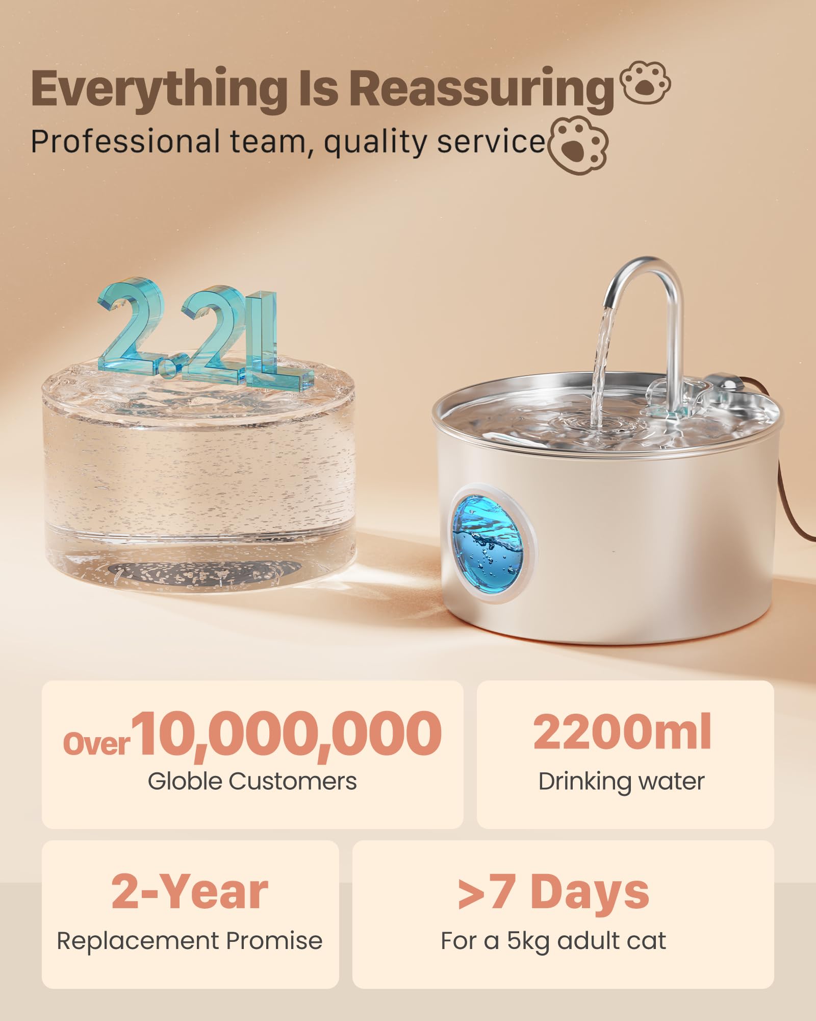 • 【Good Dreams】 The new upgraded water pump reduces the noise so you can sleep peacefully even if pet water fountain is in your bedroom. Its sound (<25dB) is less than a whisper. It is also a 0.8W low power consumption water pump, which is very energy efficient and environmentally friendly. We recommend cleaning the water pump every 2 weeks to prevent it from getting clogged with cat hair.
