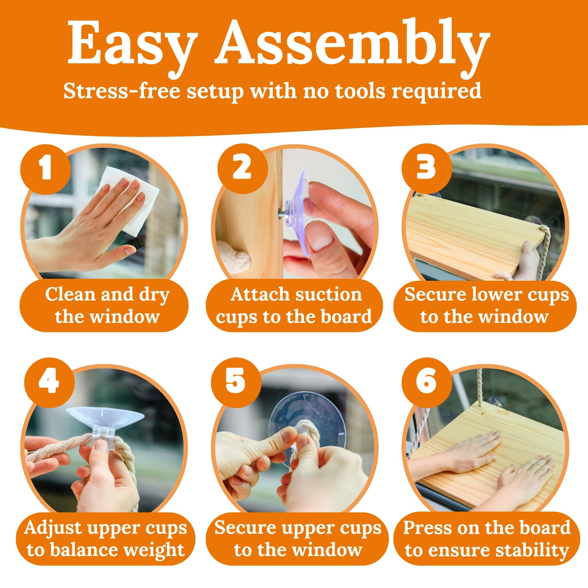 • Easy Assembly: With simple instructions, window cat bed can be set up in minutes without any tools, but remember to clean both the window and suction cups for optimal grip. Apply some pressure and readjust the cups if needed for maximum stability and safety.