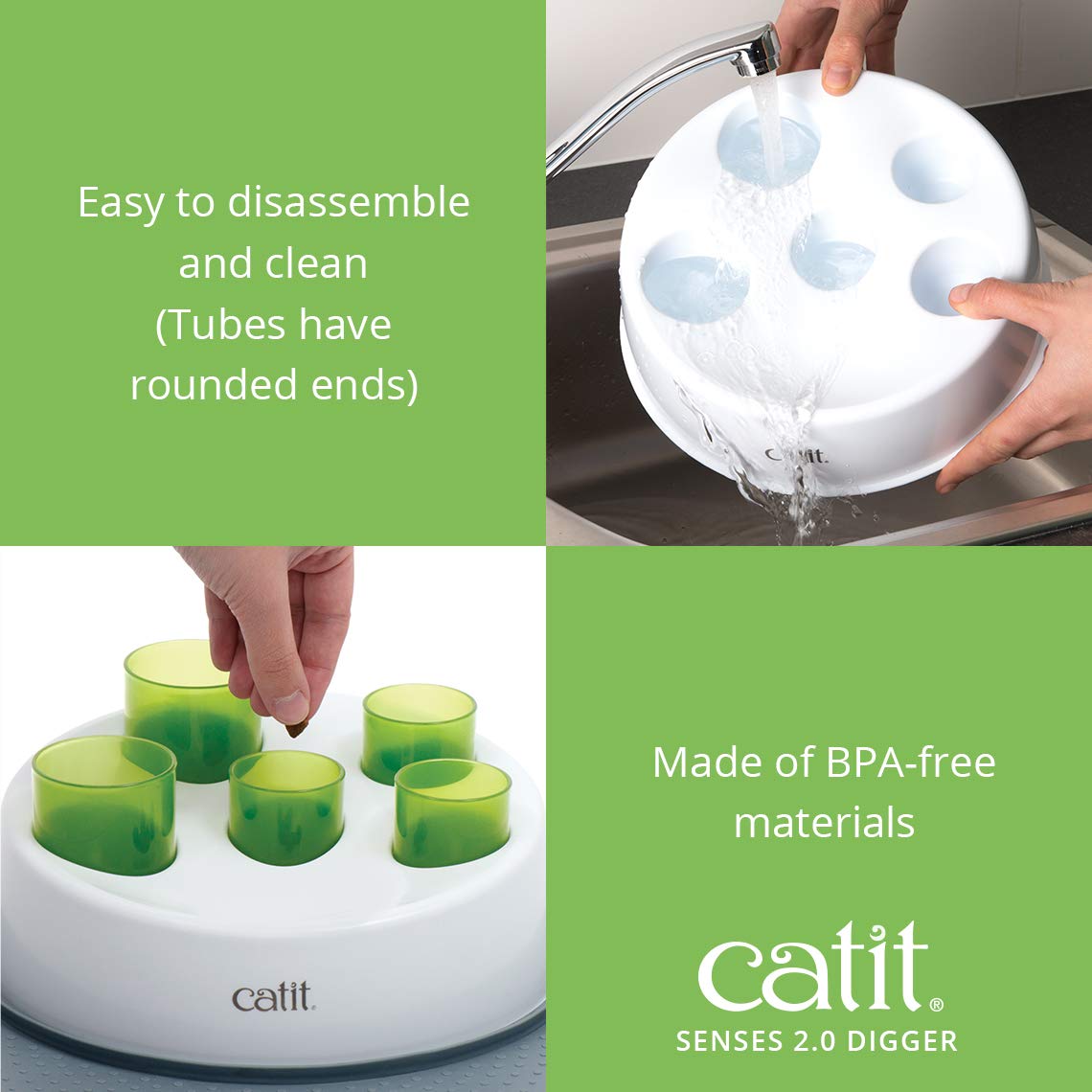 Details: The Catit Senses 2.0 Digger Cat Toy encourages cats to work for their dry food/treats in a fun and natural manner. As cats are true hunters, they need to be able to search and locate food in different locations around the house; our cat feeder toy incorporates this idea with a smart design that activates your cat's natural foraging behavior during playtime. Hiding dry kibble or treats in the Digger's multiple tubes plays on a cat's instincts to sniff and paw, while also acting as a cat slow feeder so they eat smaller portions. An interactive cat toy or feeder is a great way to stimulate activity while reducing binge eating. The slow feeder cat bowl comes equipped with 3 short-narrow tubes, 2 long-wide tubes, a stable base and a rubber mat to lock the product in place. This cat puzzle feeder is also super easy to disassemble and clean; simply remove the green tubes from the food bowl and handwash. We recommend that you handwash this item with natural soap (free of abrasive materials and water). Catit is focused on creating cat enrichment activities for all cats especially indoor cats. Cat toys for indoor cats should encourage a cat’s natural foraging and hunting behaviors. Our Catit Senses 2.0 line has created a wide variety of cat toys, with this in mind. To keep your cat interested, you need to change their cat toys set-up often, Catit Senses 2.0 is the only cat toy series that allows you to create new and exciting setups for your cat, quickly and easily. Each toy was designed to activate and stimulate your cat's unique senses, all in one fresh, green style to match any home interior, no matter the arrangement.