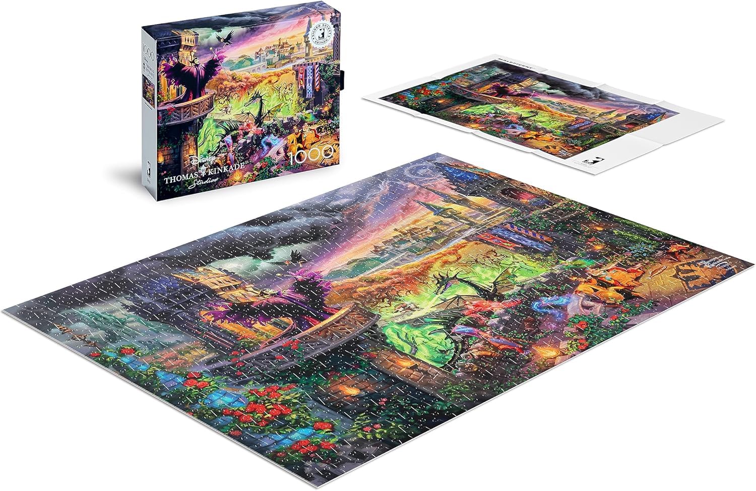 Details: 1000-piece jigsaw puzzle of Thomas Kinkade's rendition of the villainous Maleficent.