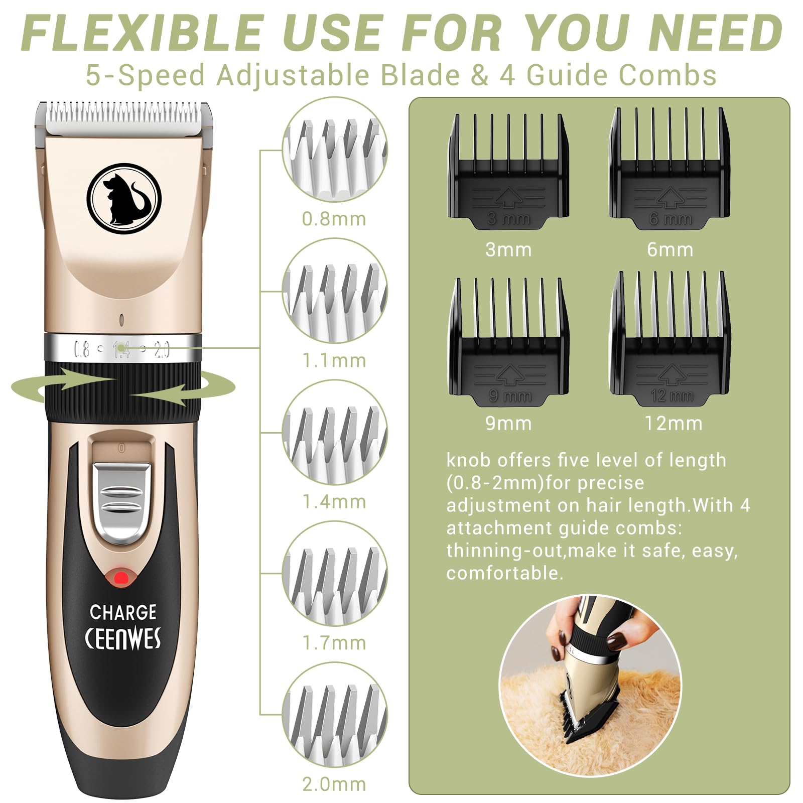 Ceenwes Dog Clippers Low Noise Pet Clippers Rechargeable Trimmer Cordless Grooming Tool Professional Dog Hair Trimmer with Comb Guides Scissors for Dogs Cats & Others(Gold)