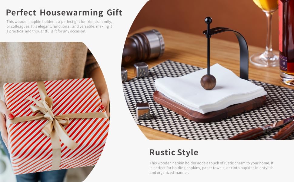 • Perfect Gift: This wooden napkin holder is an excellent present for friends, family, or colleagues on different occasions. Its elegant design and practical features make it a great choice. At Christmas, it can bring warmth to the dinner table. It's also suitable for Thanksgiving and birthdays, adding a thoughtful touch. During Easter, it fits well in brunches. Overall, it's a practical and meaningful gift for any Western festival or celebration and is sure to be liked.