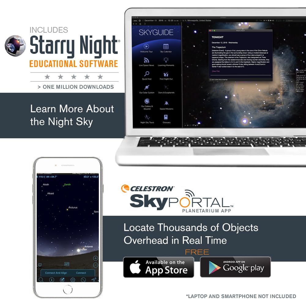 • BONUS BACKPACK AND SOFTWARE: Includes a padded backpack with room for accessories, a finderscope, star diagonal, eyepieces, a smartphone adapter, and a free download of Starry Night software to help you identify celestial objects and plan your next stargazing session