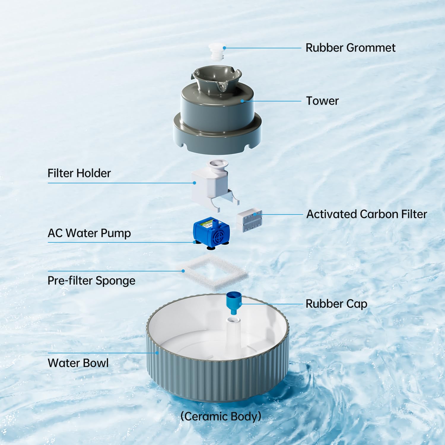 • 😽【Multi-Filtration, Water Purification】: Equipped with activated carbon filter and pre-sponge filter, which can remove sediment, debris and pet hair, this ceramic pet water dispenser can provide a constant supply of flowing purified water. Note: It is healthier to change the filter every 4 weeks!