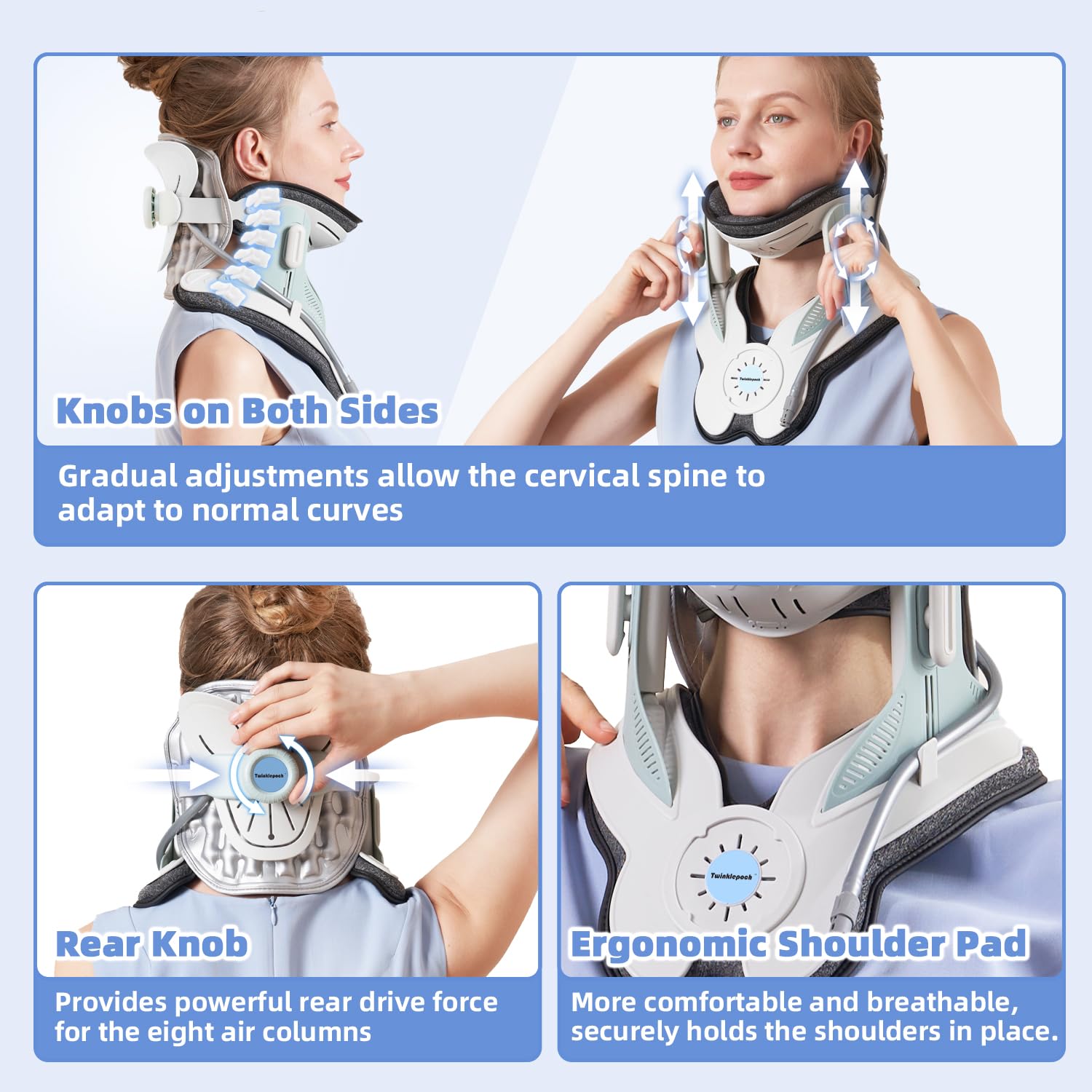 • 3.The new neck traction device firmly fixes the shoulder through the ergonomic shoulder pad. The rear knob forms a rear drive force to provide effective pressure to the eight air columns. Knobs on both sides adjust the height synchronously to fully open the vertebral space in an all-round way and release the oppressed nerves.