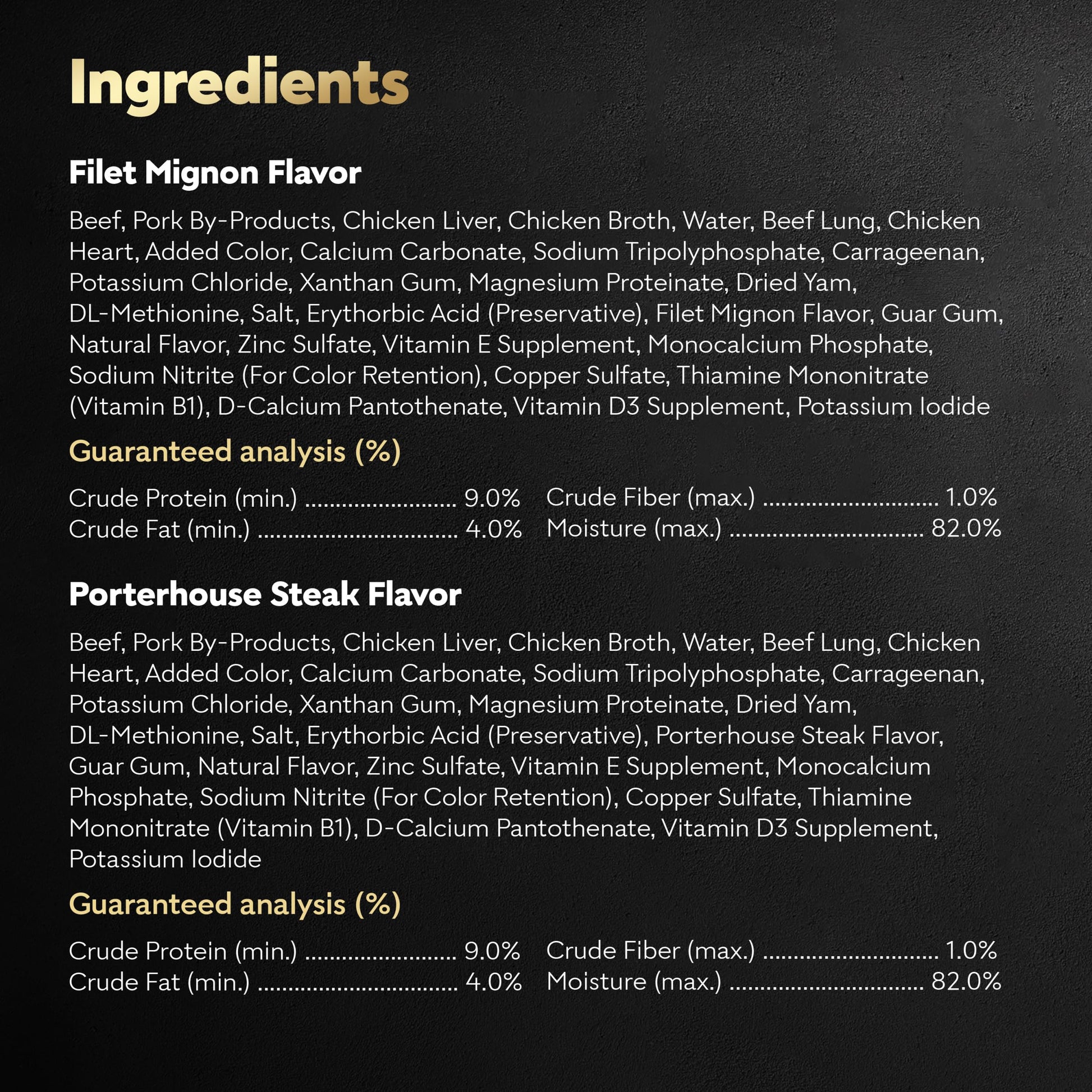 Details: The Cesar brand knows that the best way to show your dog love is by keeping them happy and healthy with gourmet meals. With beef as the #1 ingredient, Cesar Wet Dog Food Classic Loaf in Sauce Filet Mignon and Porterhouse Steak Flavors Variety Pack gives your dog great flavor and a delicious meal. This product contains no fillers, no artificial flavors, and is formulated without grains*. Made in the USA with the finest ingredients from around the world, you can be sure your best friend is getting a high quality meal. This gourmet soft dog food is also served in convenient trays with easy peel away seals. Thanks to Cesar, you can give your dog a healthy meal that they will love and love you for (*Trace amounts may be present due to cross-contact during manufacturing).