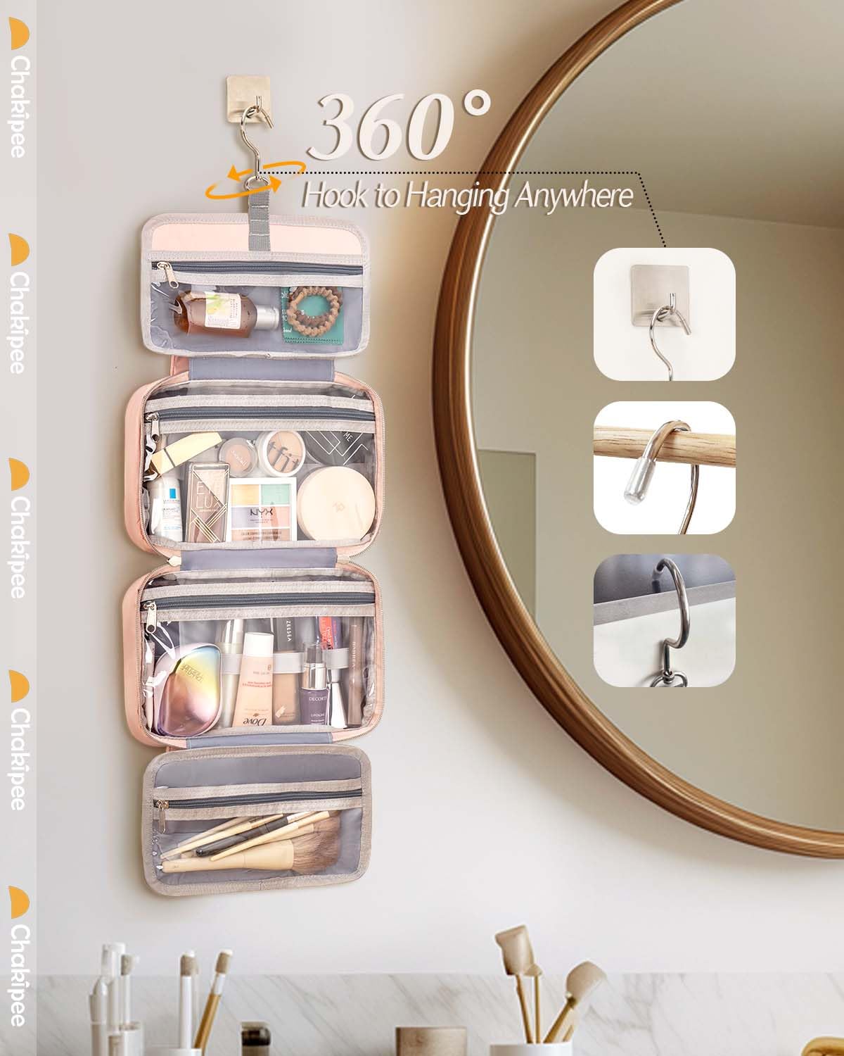 Chakipee Travel Hanging Toiletry Bag for Women - Waterproof Cosmetic Organizer with Clear Window, Lightweight Bathroom Bags for Essentials, Makeup, Shampoo, Toiletries (Pink, Medium)