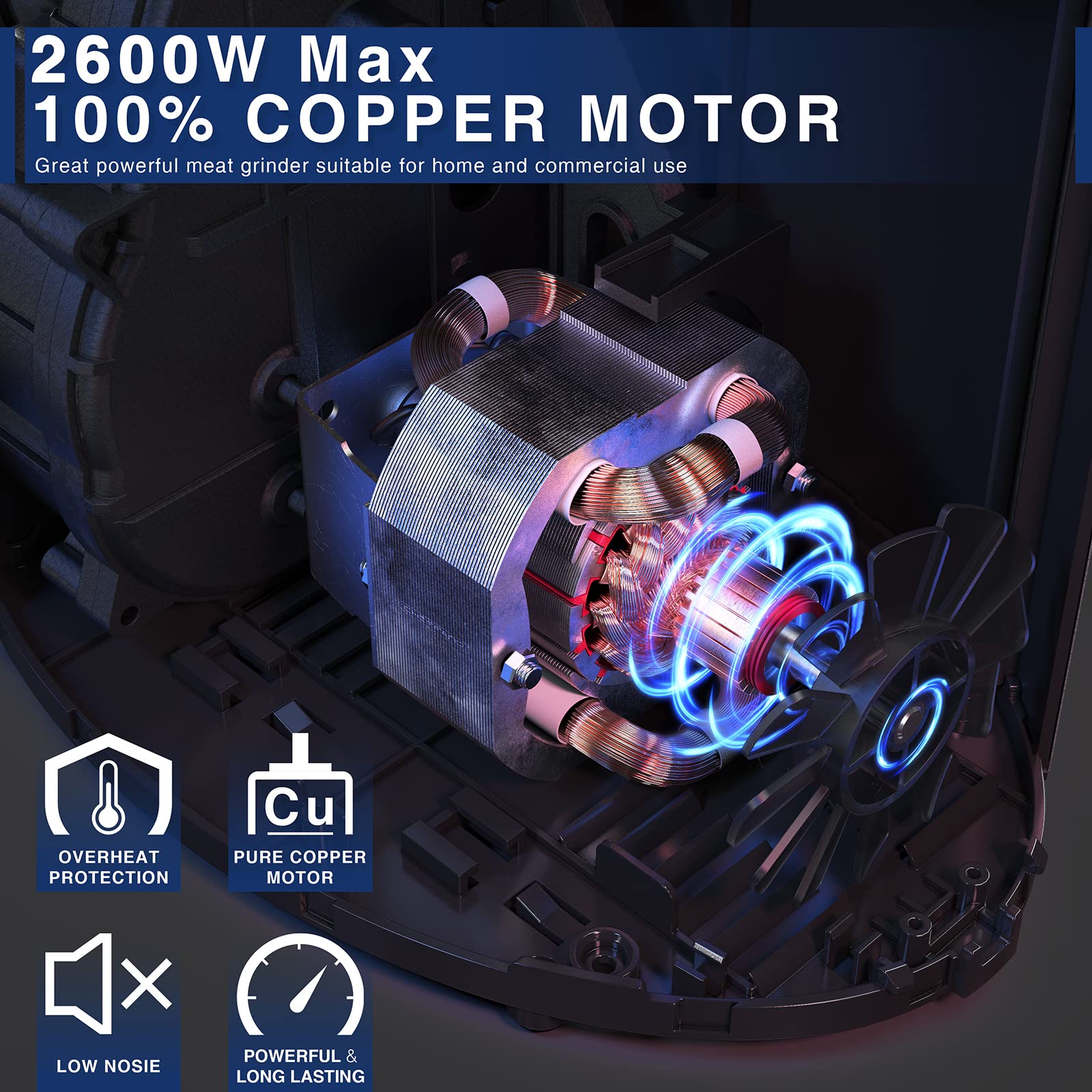 • [Powerful Motor] The meat grinder mechanical is using the 100% pure copper motor normal rated power up to 350W and the peak value can reach up to 2600 watt. Various meats and vegatables can be ground efficiently- opproximately 180 lbs meat/hour, great for saving your time and labor t grind it.