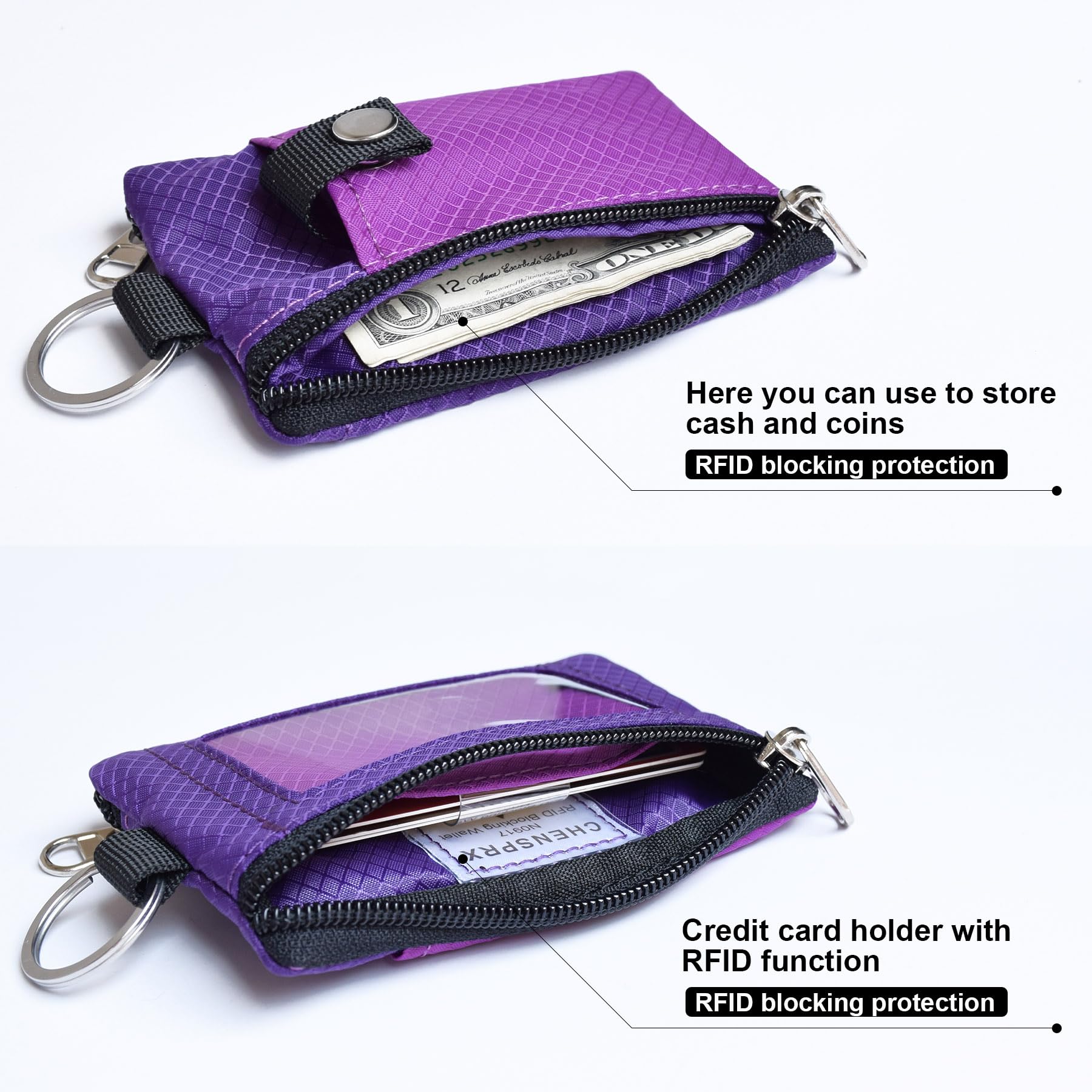 CHENSPRX Minimalist RFID Blocking Small Wallet with ID Window,WaterResistant Zip Id Case Wallet with Lanyard Keychain for Cards,Cash,Travel,Women,Men (Violet+purple)