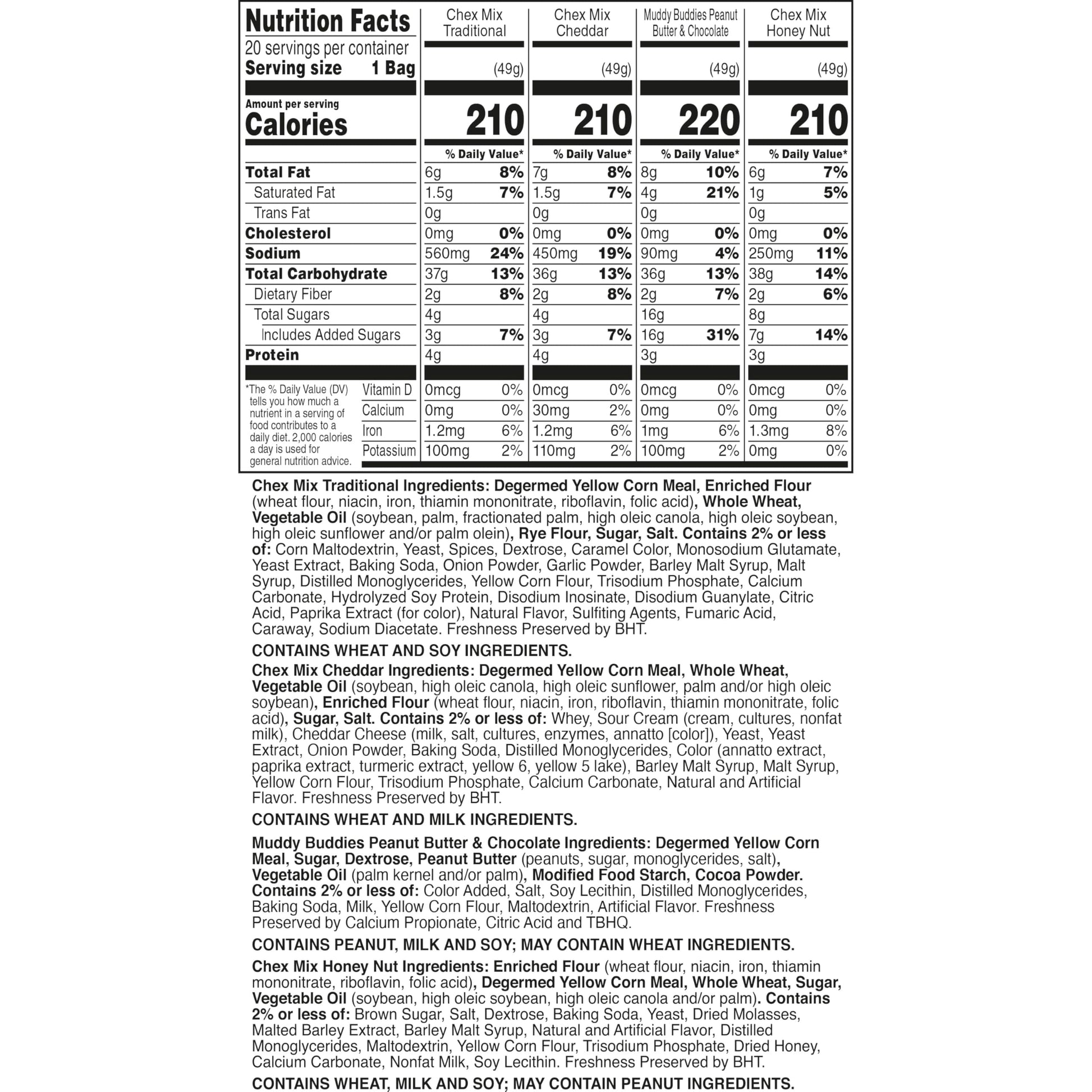 - What's inside: One 35 oz (2.19 lb) snack variety pack with 5 Muddy Buddies peanut butter & chocolate, 5 Chex Mix traditional, 5 cheddar, and 5 honey nut; contains milk, soy, wheat, and peanuts.