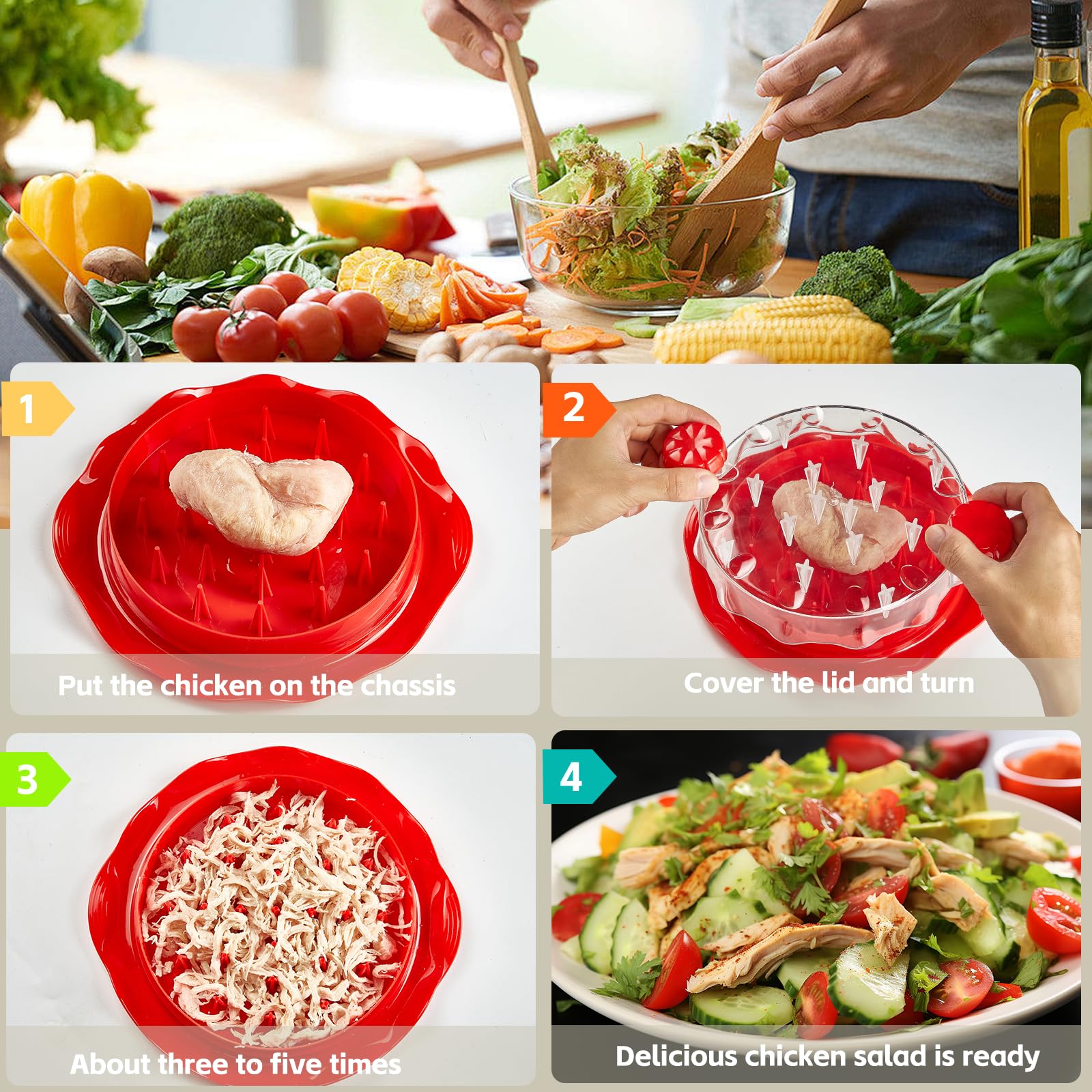 • TIME SAVING TRANSPARENT LID:Our professional chicken shredder,featuring an upgraded rotating design and a transparent lid,you could shred the meats in seconds or choose how shredded you want(chicken nugget or shredded chicken).It is also great for shredding pulled pork,beef and other vegetables efficiently.