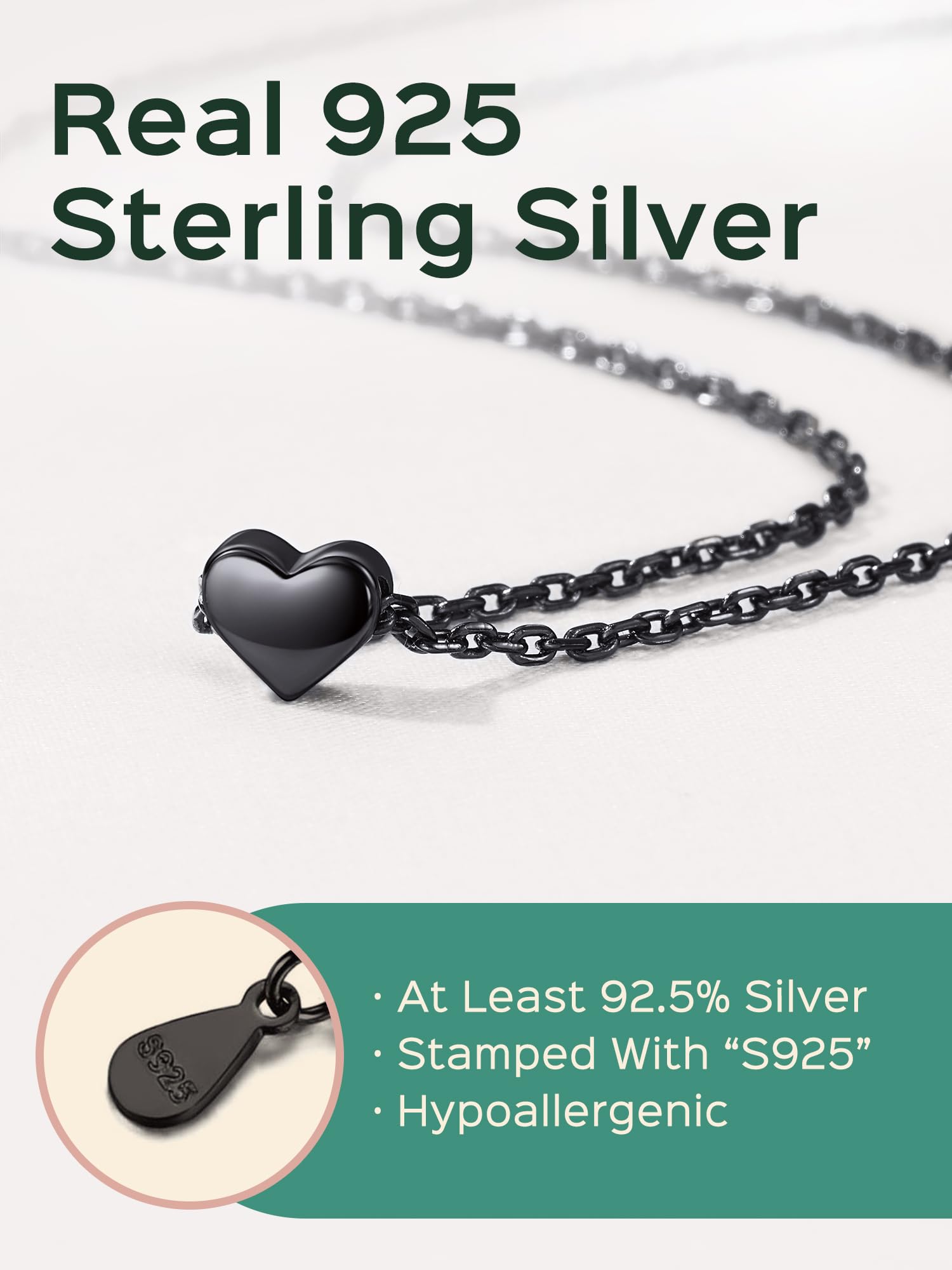 • Hypoallergenic 925 Sterling Silver Necklace: Made from hypoallergenic platinum-plated sterling silver, this black heart necklace passes strict skin tests to ensure it’s free from allergens and nickel, making it safe for sensitive skin. Fade-resistant and durable, it retains its shine for years, offering lasting elegance and comfort