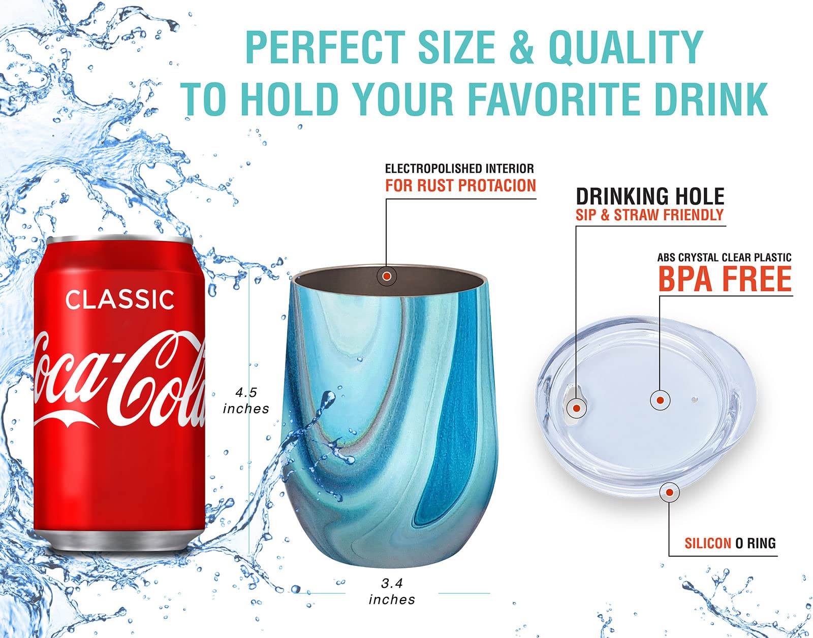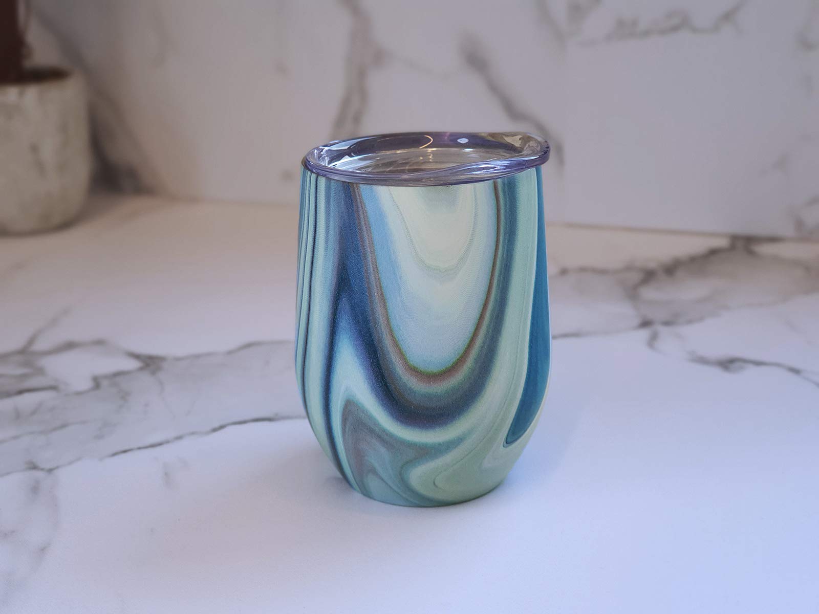 • Double Wall Vacuum Insulated Perfection in a ocean marble wine tumbler made from lifelong Stainless Steel! Set off on your refreshing picnic, hiking or camping adventures with your water, wine, or cocktail icy-cold for 9 hours or your coffee & tea scalding-hot for over 3 hours! It is an insulated stainless steel wine glass w/ a removable BPA-free lid, designed for sweat-free convenience! Use it as a wine glass tumbler or stick your straw in your refreshing drink through the straw-friendly lid!