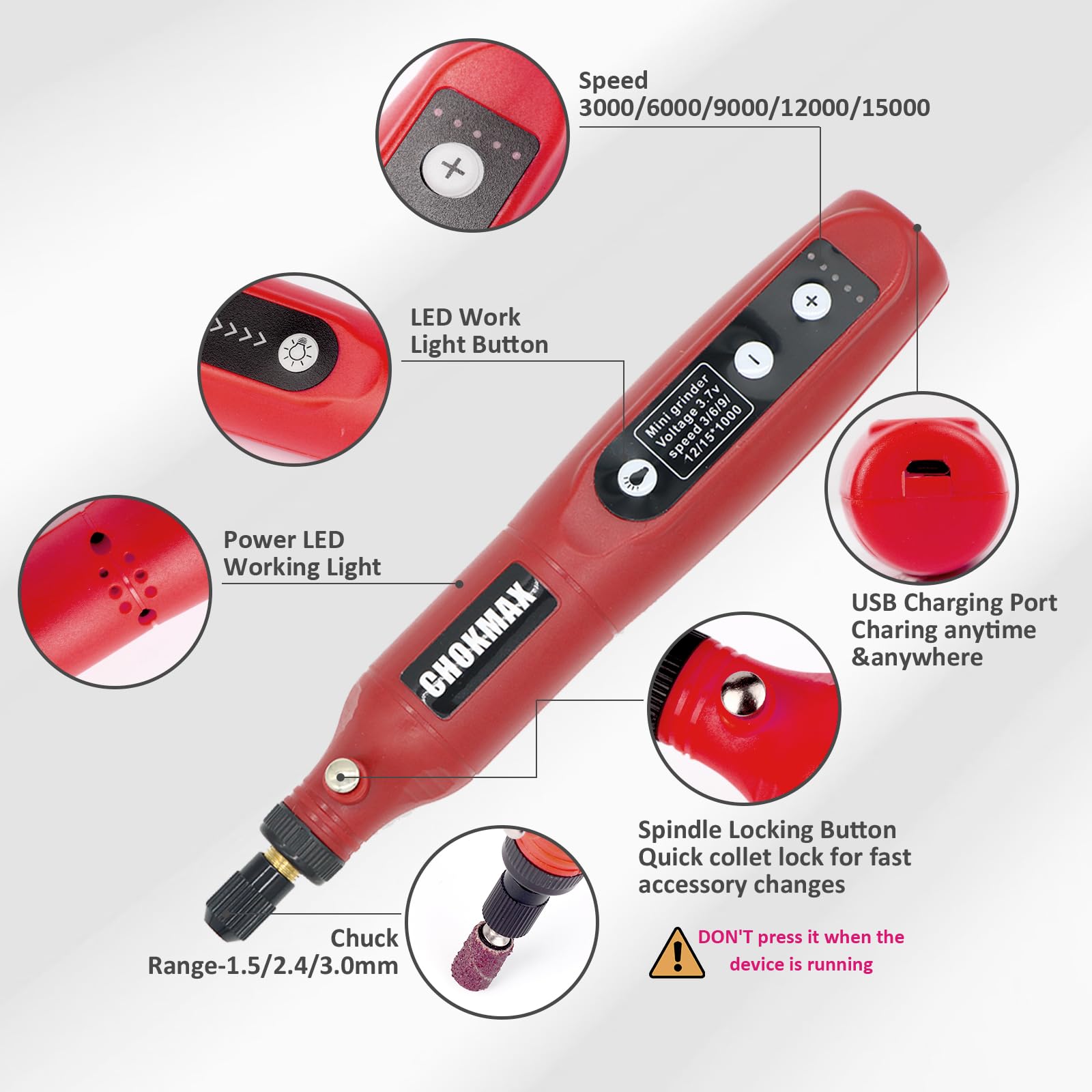 CHOKMAX Cordless Rotary Tool Kit, 3.7V Mini Grinder with 5 Variable Speed, Front LED Work Light, 42pcs Accessories Electric Multi-Tool for Polishing, Cleaning and Engraving