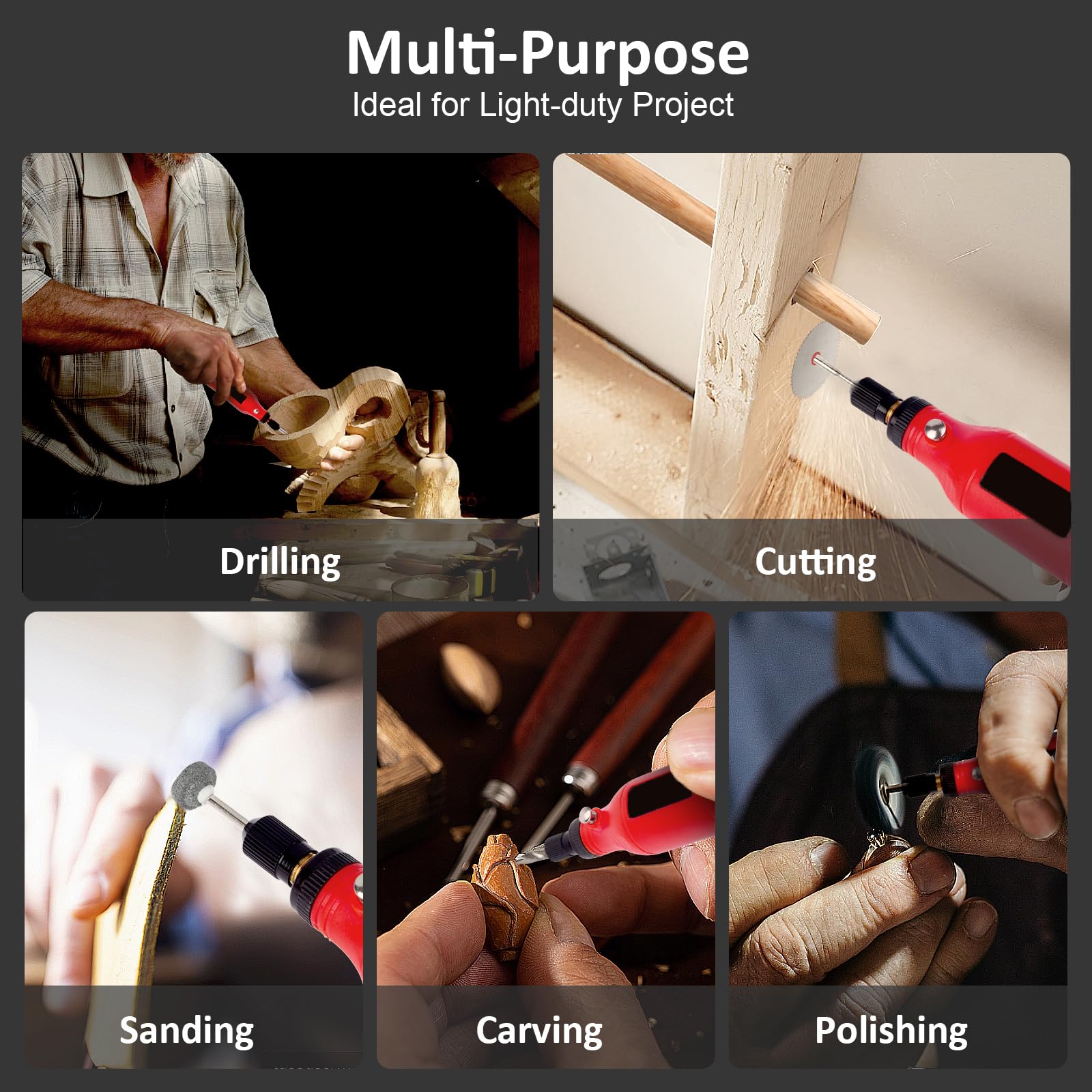 • 5 VARIABLE SPEEDS ADJUSTMENT - With 5 adjustable speeds (3000/6000/9000/12000/15000 RPM), our mini rotary tool empowers you to effortlessly tackle any small DIY project. Even if you're a beginner, still can experience effortless control joy. The cloud-lightweight feeling reduces hand strain, allows you to work for hours without fatigue.