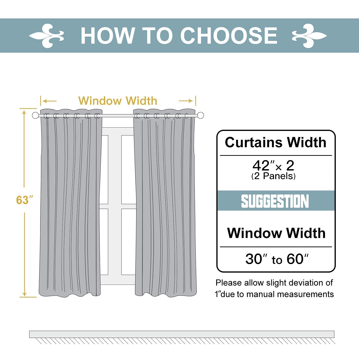• SET DETAILS: 2 charcoal gray curtains per package. Each panel measures 42 inch wide by 63 inch long with 6 silver metal grommets (1.6 inch inner diameter) on top, easy to install and slide.