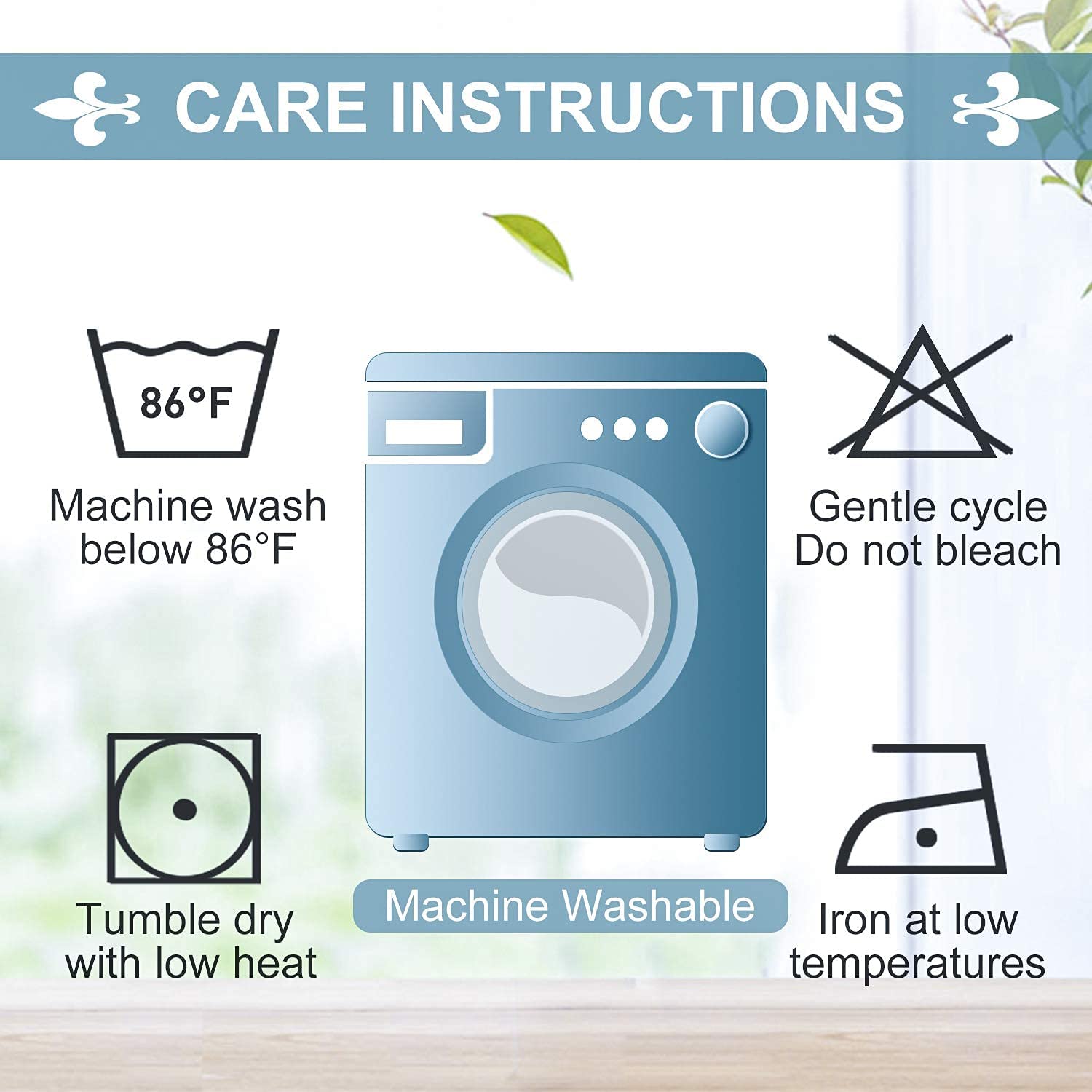 • EASY CARE: these privacy drapes are machine washable below 86℉; Gentle cycle; Do not bleach; Tumble dry low; Warm iron.