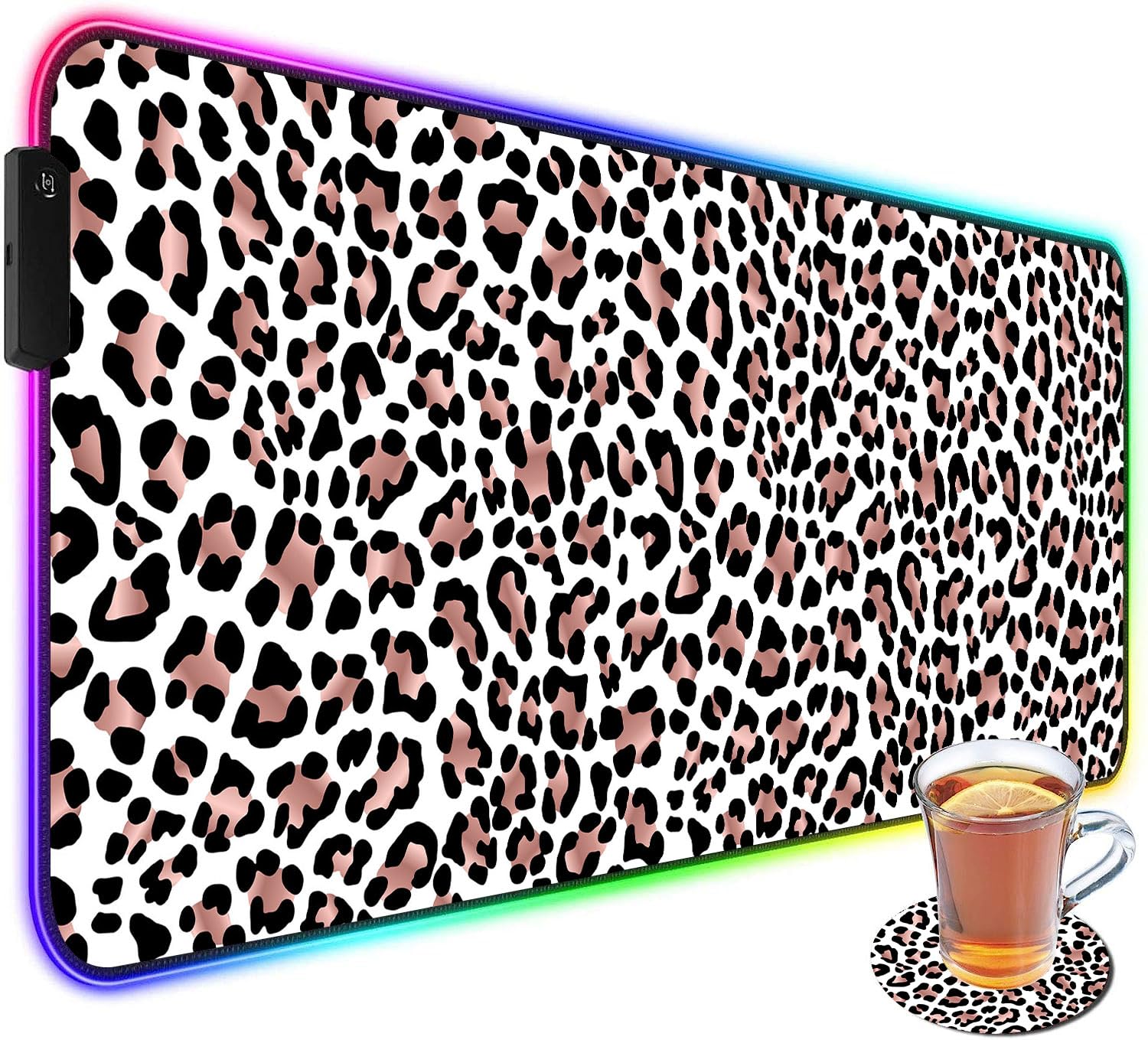 CICPLKSE Customized RGB Gaming Mouse Pad and Coffee Coaster,Large Glowing Led Anti-Slip Rubber Base Computer Keyboard Desk Mouse Mat 31.4x11.8 Inch,Leopard Print