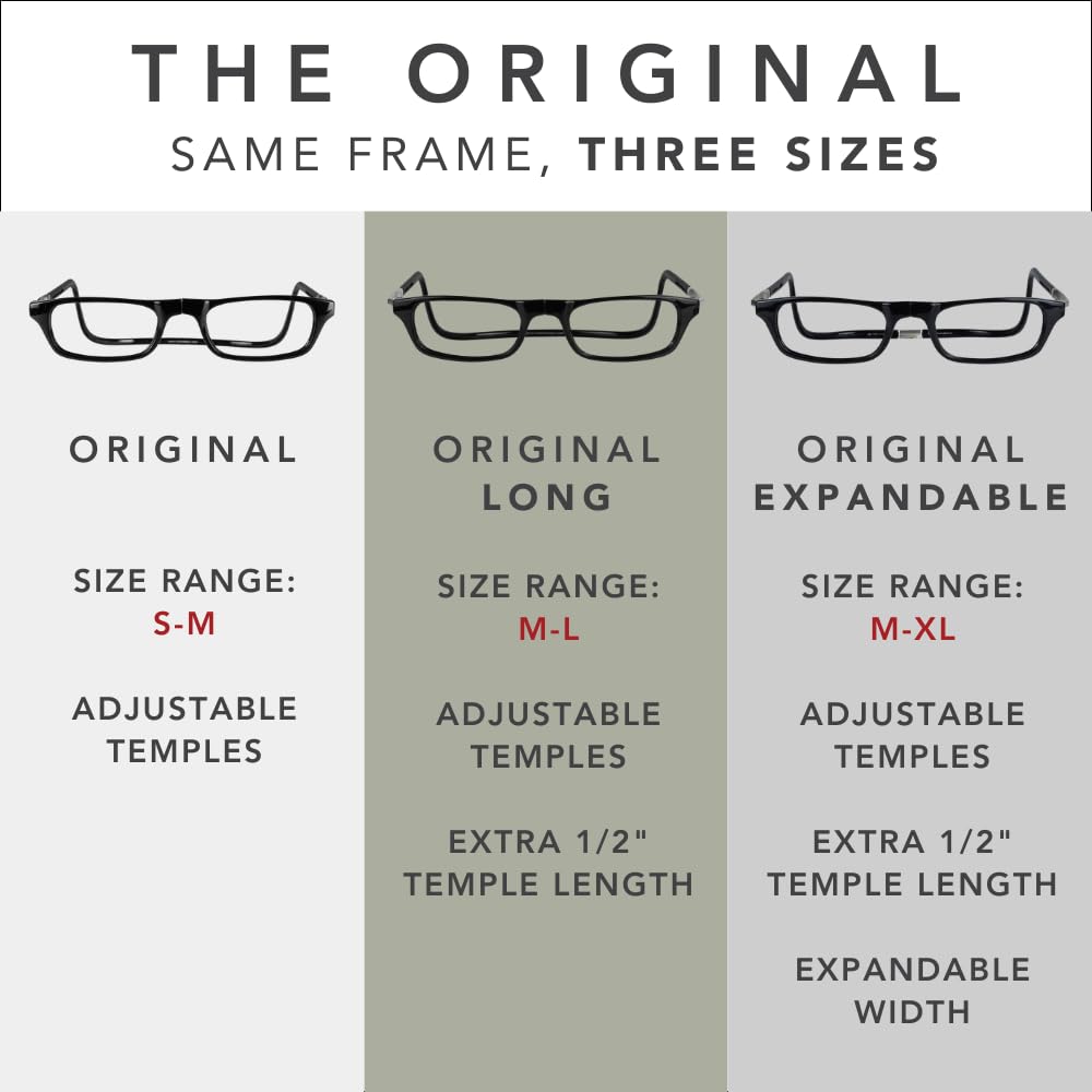 • SIZE RANGE: Medium to Large (M-L). All CliC glasses have adjustable temples that can be fully closed or extended to fit a range of sizes. This style provides an additional ½” in length and 35° stem for a wider feel. See our size chart for specific measurements.