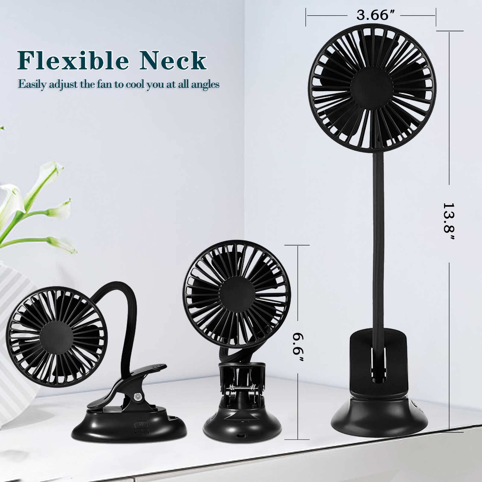 Clip On USB Mini Desk Fan with Emergency Power Bank, Battery Operated Rechargeable Portable Fan - Flexible Neck, 3 Speed Personal Cooling for Baby Stroller, Car, Camping, Office, Dorm, Beach - Black