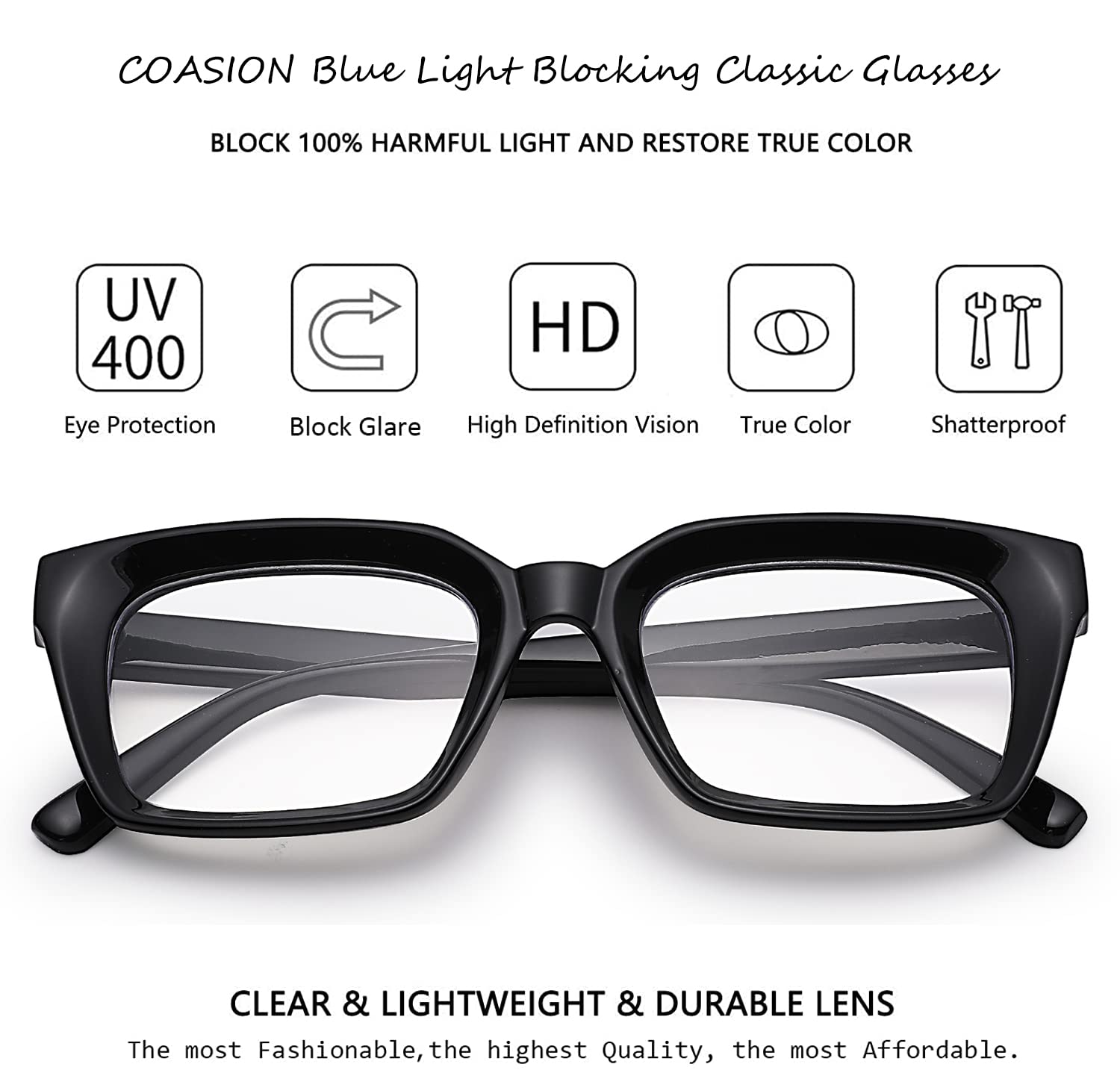 COASION Blue Light Blocking Eyeglasses Classic Thick Square Rim Frame Eyewear for Women Men (Bright Black)