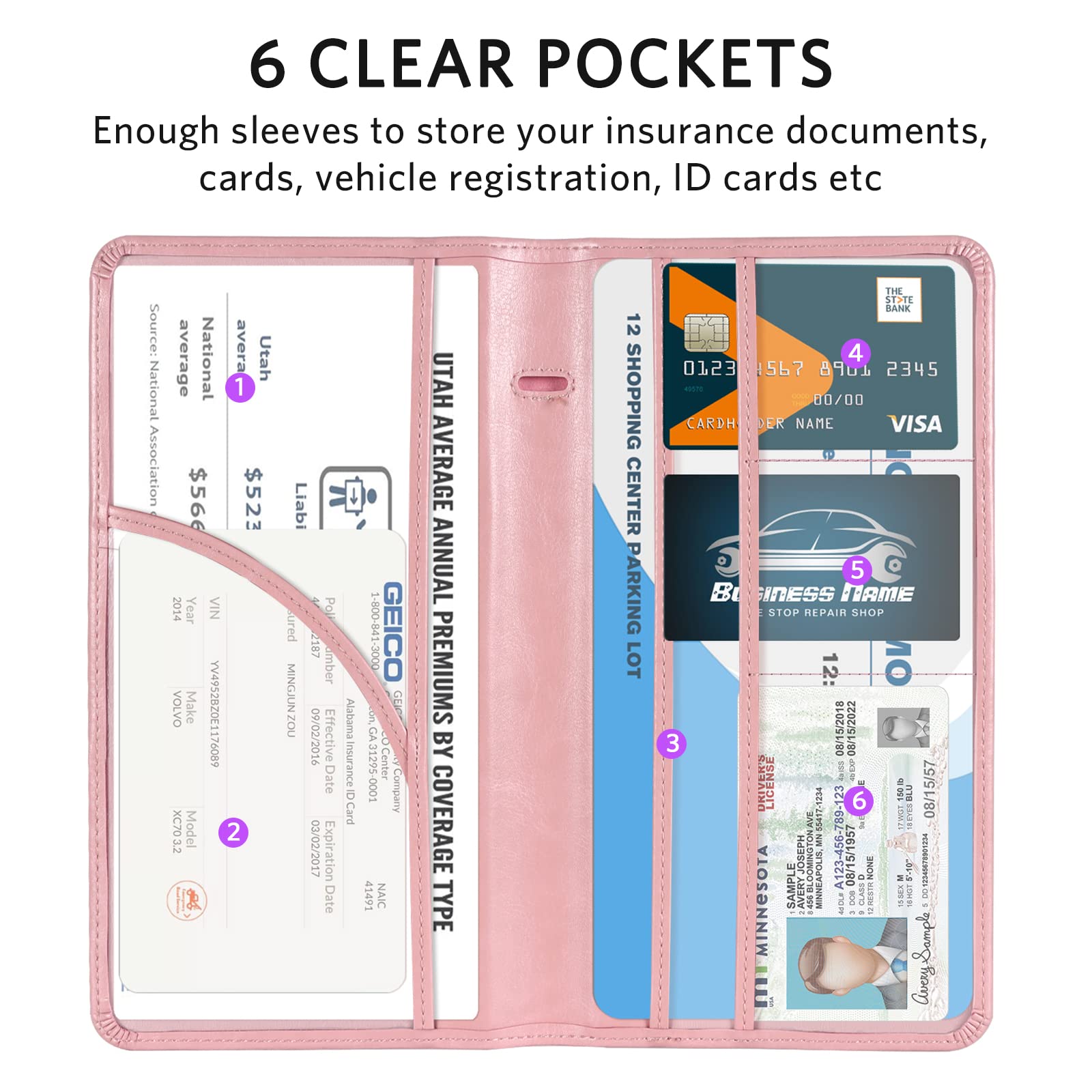 • 6 COMPARMENTS: Comes with 3 large pockets for insurance documents, vehicle registrations cards and other valueable information. And 3 small pocket for driver's license, ID cards, business cards, key contact information cards.