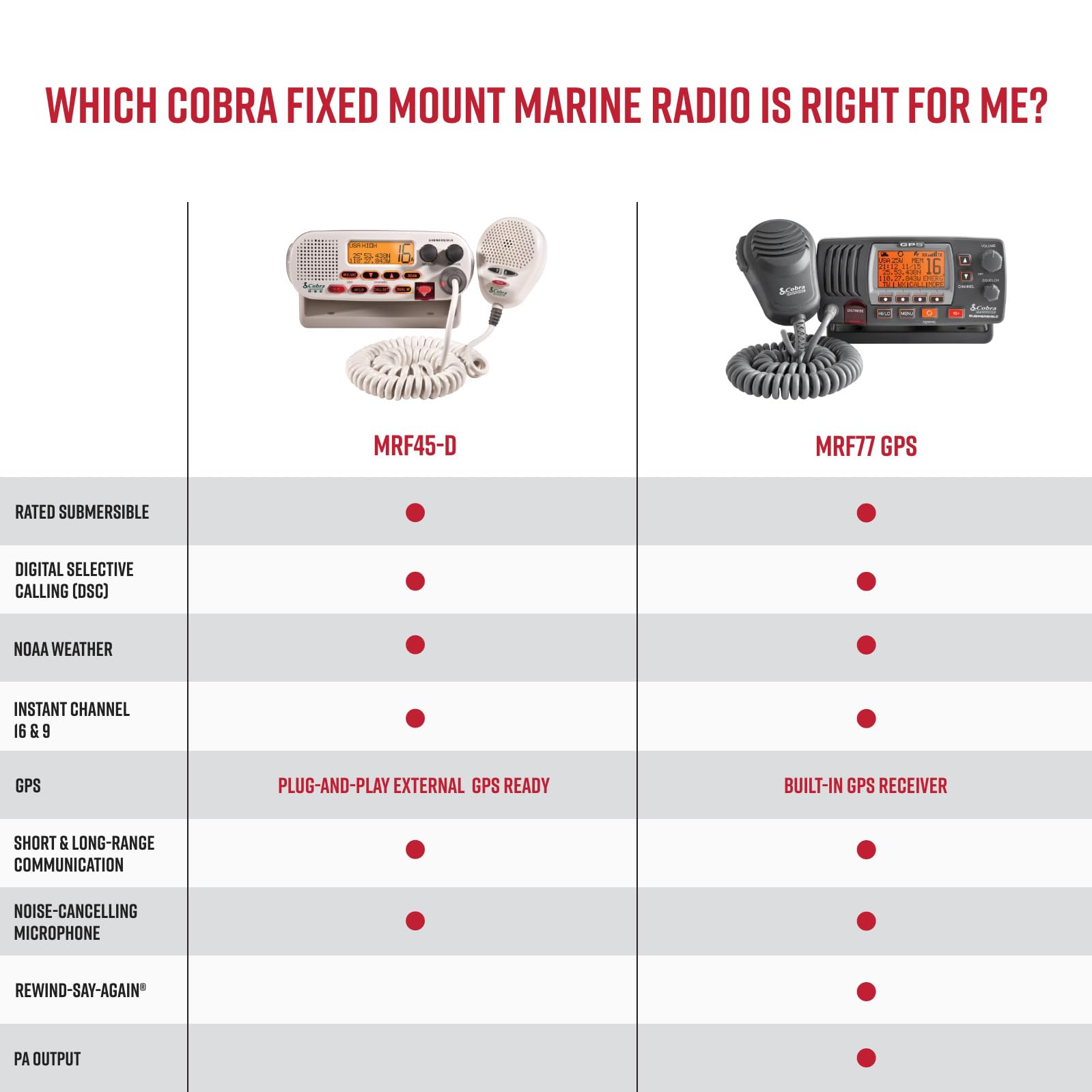 Details: View larger View larger Cobra Electronics MR F45-D Class-D Fixed Mount VHF Radio The Cobra MR F45 is a full function DSC-capable VHF radio. The selectable 1 or 25 Watt output is perfect for short or long-range communication. This unit has features usually reserved for more costly VHF radio units including Dual Watch, an adjustable backlight, and function keys on the mic. Includes The MR F45-D includes all of the core features of Cobra's fixed mount radios like; Noise canceling microphone, NOAA Weather Radio, Weather Alert, JIS7 Submersible, Instant channel 16/9, Scan, DSC call log, External speaker jack, Illuminated LCD display, Signal strength meter, GPS input capability, etc. Compliant with the latest FCC specifications for Class-D VHF Radios. Features: Class D DSC (Digital Selective Calling) - Allows you to send a distress signal at the touch of a button or exchange position information with other boats or stations. 1 or 25 Watts - Dual output power for short and long communication. USA, Cananda & International Channels - Allows operation on any of the three different channel maps established for these areas. 10 NOAA Weather Channels - Instant access to national All Hazards and weather information, 24 hours a day. Weather Alert - Alerts with an audible tone and visual alarm if threatening weather is nearby. MR F45-D Features & Specs.