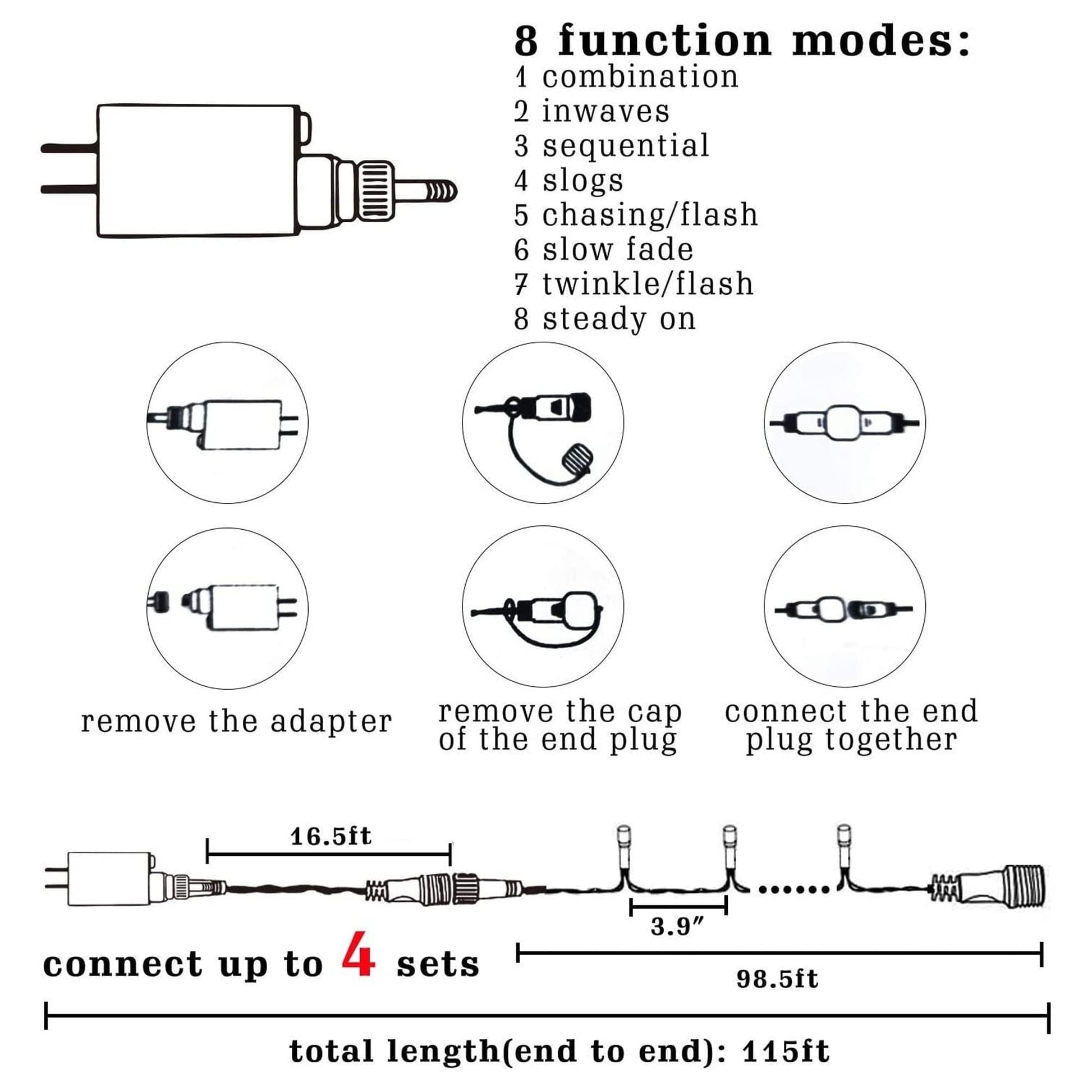• 8 Modes: Halloween 300 LED string lights with 8 light modes: combination, in waves, sequential, slogs, chasing/flash, slow fade, twinkle/flash, by pressing the button on the plug to change the mode.