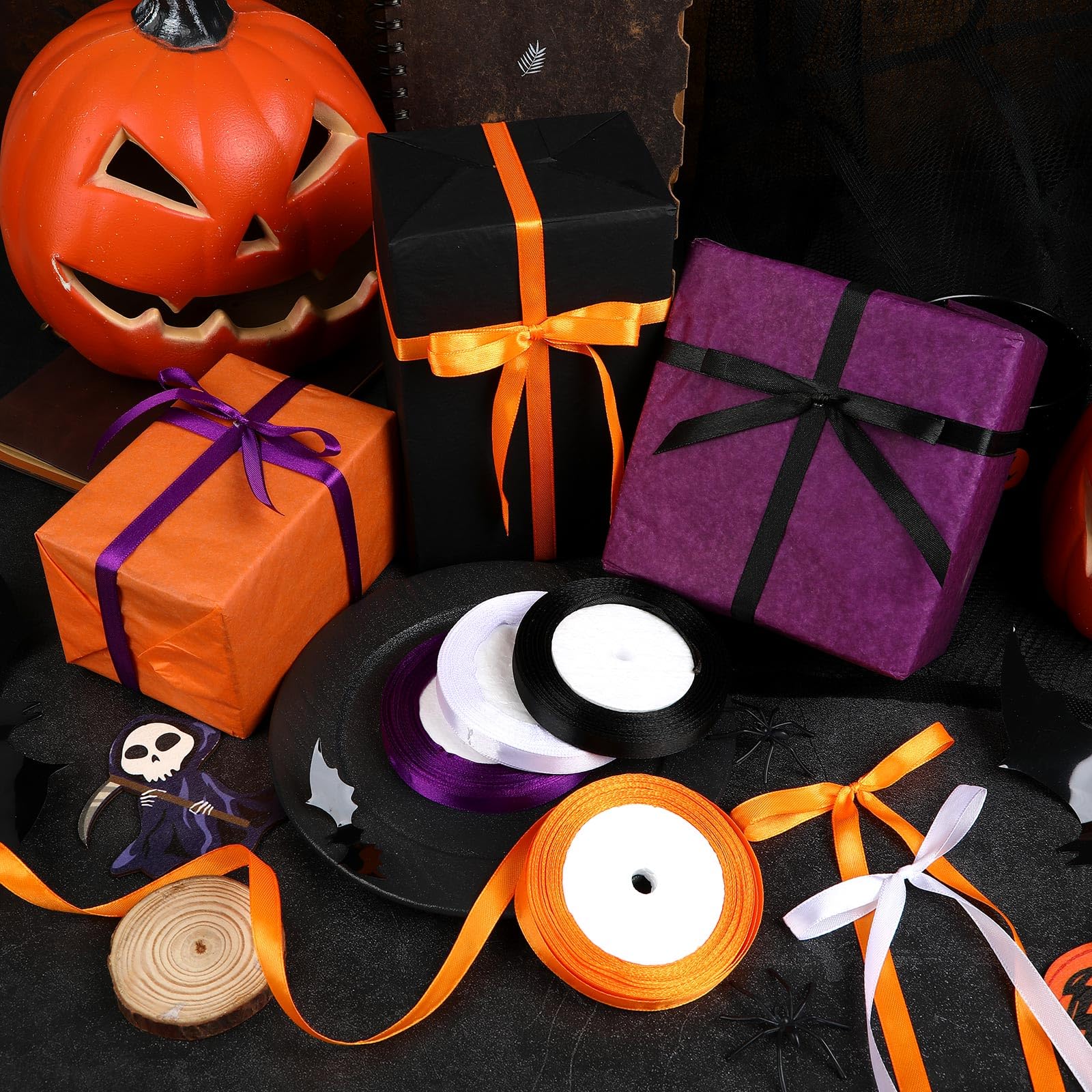 • Package Includes: You will get 4 rolls of Halloween ribbons in 4 colors, orange, purple, black and white, each color has 25 yards, a total of 100 yards. With complete colors and enough length, the orange black ribbon is suitable for your various Halloween party decorations