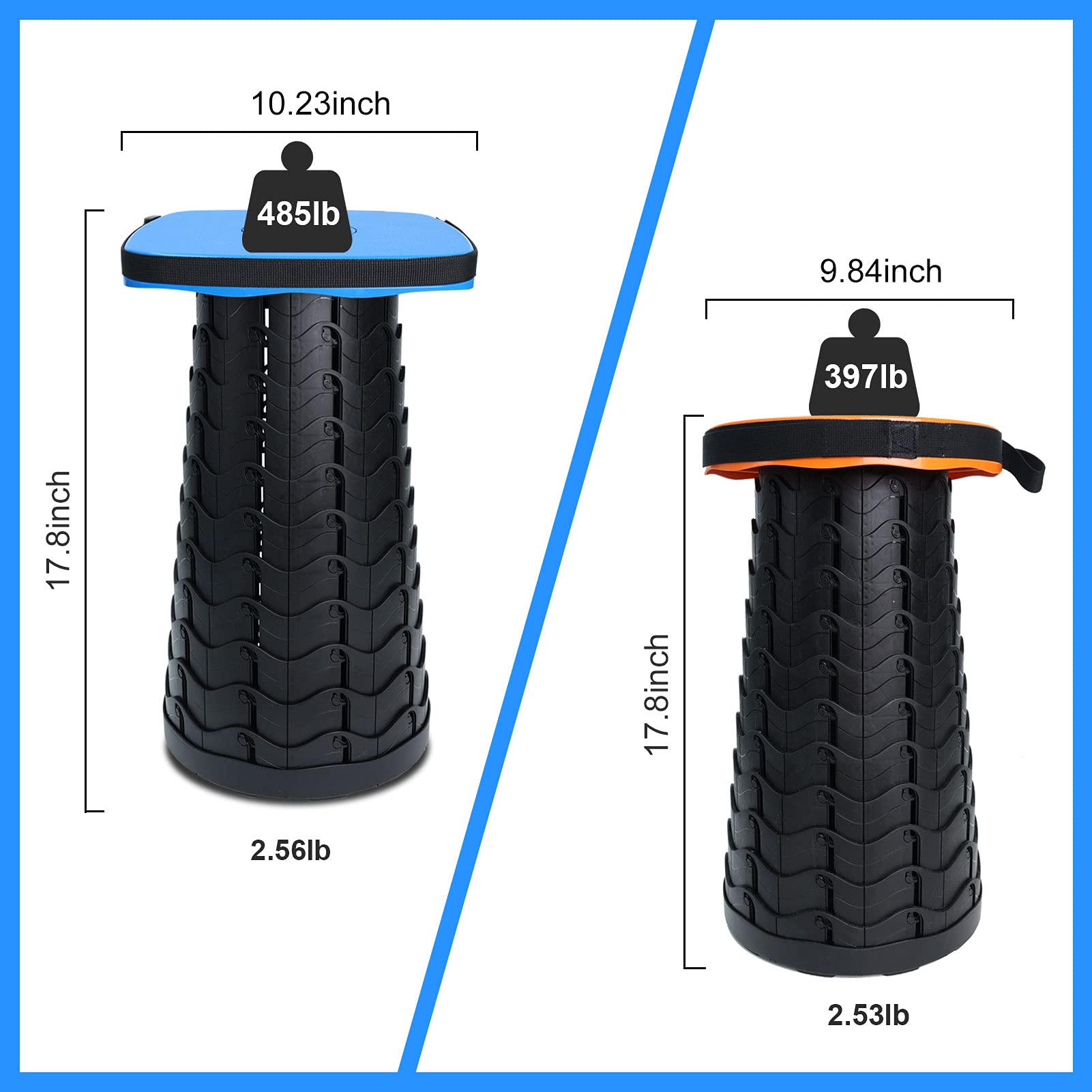 • Upgraded Square Collapsible Stool : Compared with round collapsible stool, the area is changed from 76 to 104 sq in, and the load capacity is upgraded from 397lbs to 485 lbs