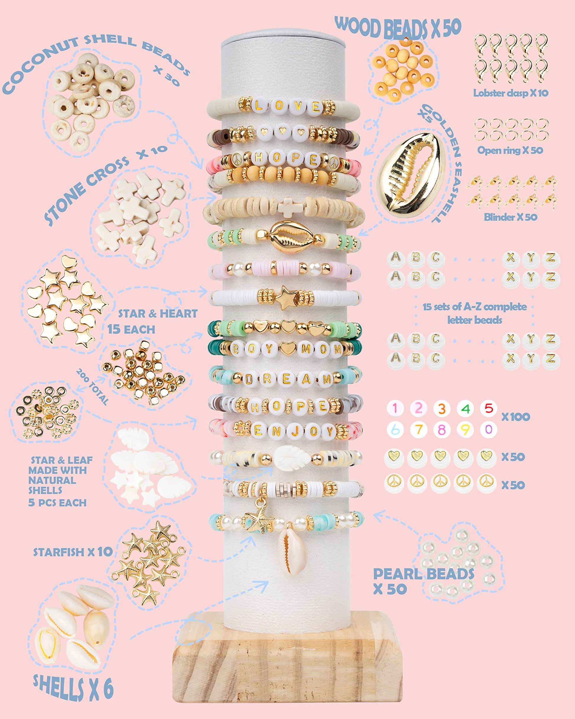 • 📝【All YOU NEED INCLUDE】- This heishi beads kit includes 4800 pcs clay beads in 24 colors, 390 pcs(15 sets of A-Z) alphabet beads and number beads, 50 pcs heart beads, 50 pcs peace beads, 6 sets ear wire and hoop, 15 pcs golden stars, 15 pcs golden hearts, 10 pcs golden starfishes, 5 pcs golden shells, 10 pcs stone-made cross.... It’s too much to write one by one, and everything shown on the picture contains except the stand.