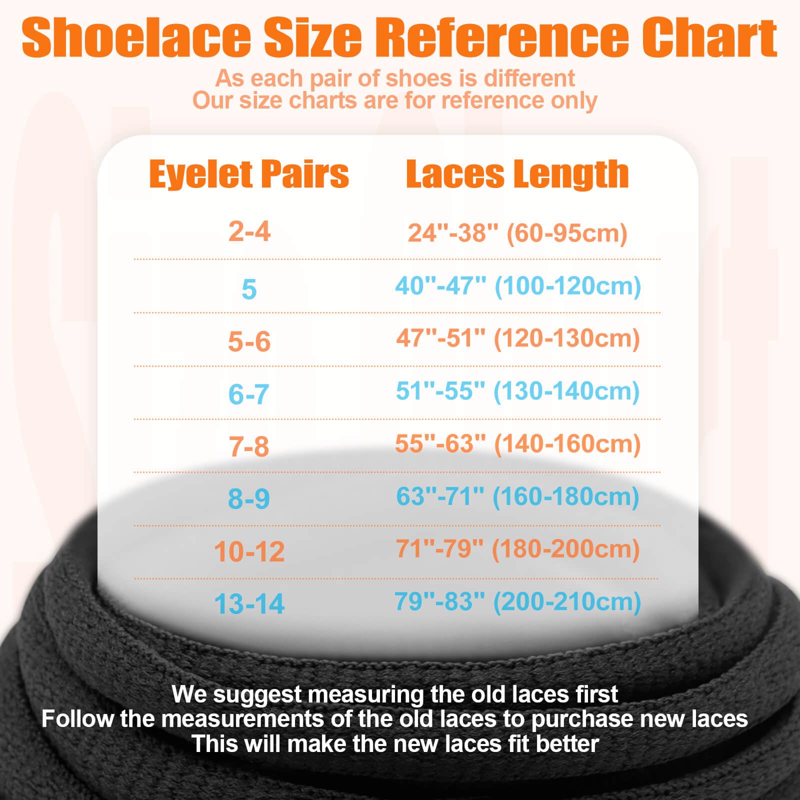 • [Steps to Use] Take off the shoelace that is now on it and measure the length from tip to tip. This is the required length. If your previous laces are too short or too long, add or subtract from your laces. Attention: the length of 60 cm - 95 cm is more suitable for shoes with less than 4 holes; For shoelaces over 100 cm in length, we recommend shoes with 5 or more holes