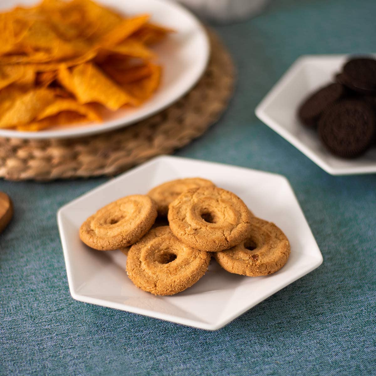 • Modern Aesthetic Design: A nice benefit to the Delling appetizer plates over more conventional square or circular dessert Plates is the geometric design, these snack plates feel silky smooth to the touch, the angular is beautiful and shiny,more modern yet well made. These charming white plates adds a touch of interest to any food served.