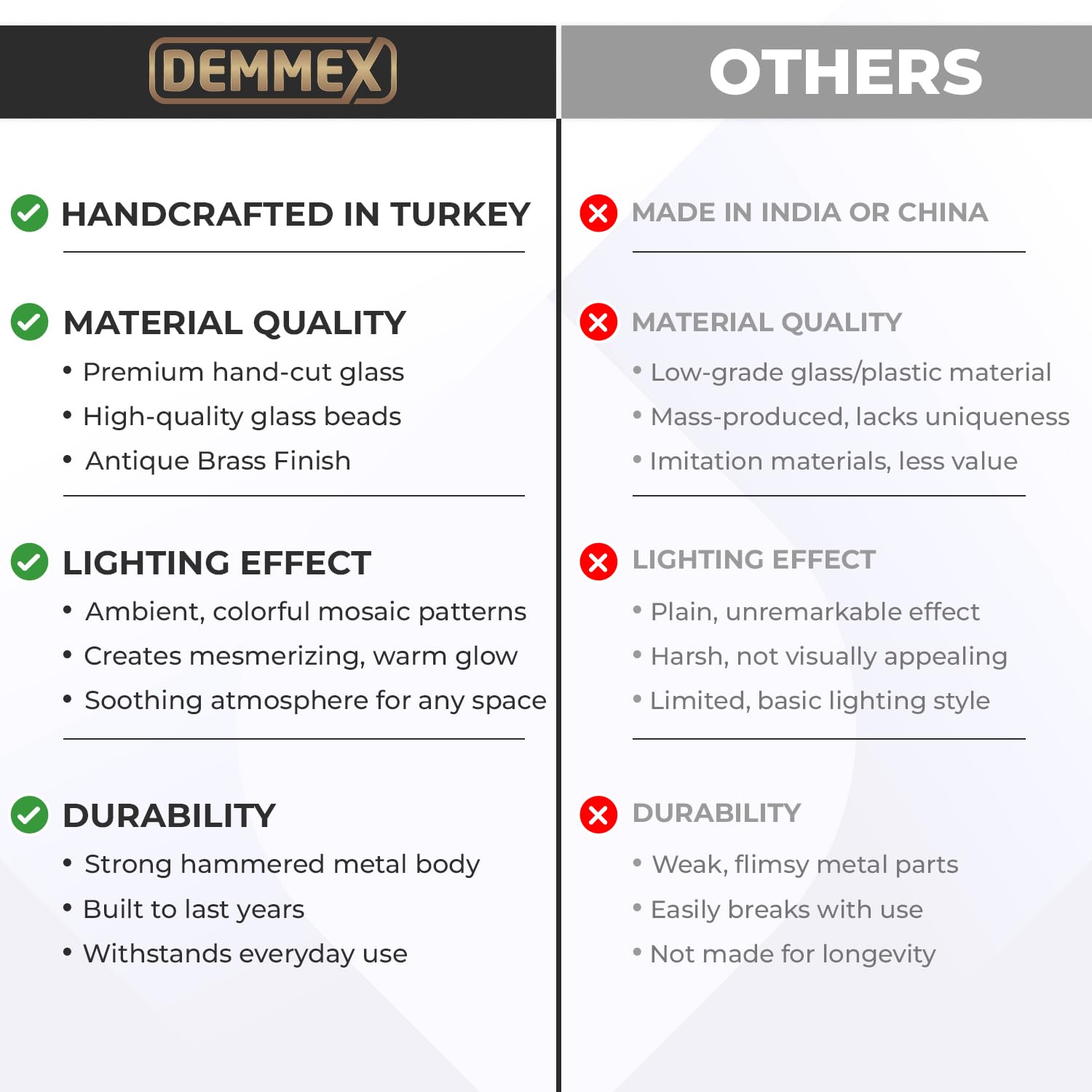 • 100% HANDMADE IN TURKEY: Every piece is crafted by skilled Turkish artisans, making each lamp a one-of-a-kind work of art infused with cultural authenticity.