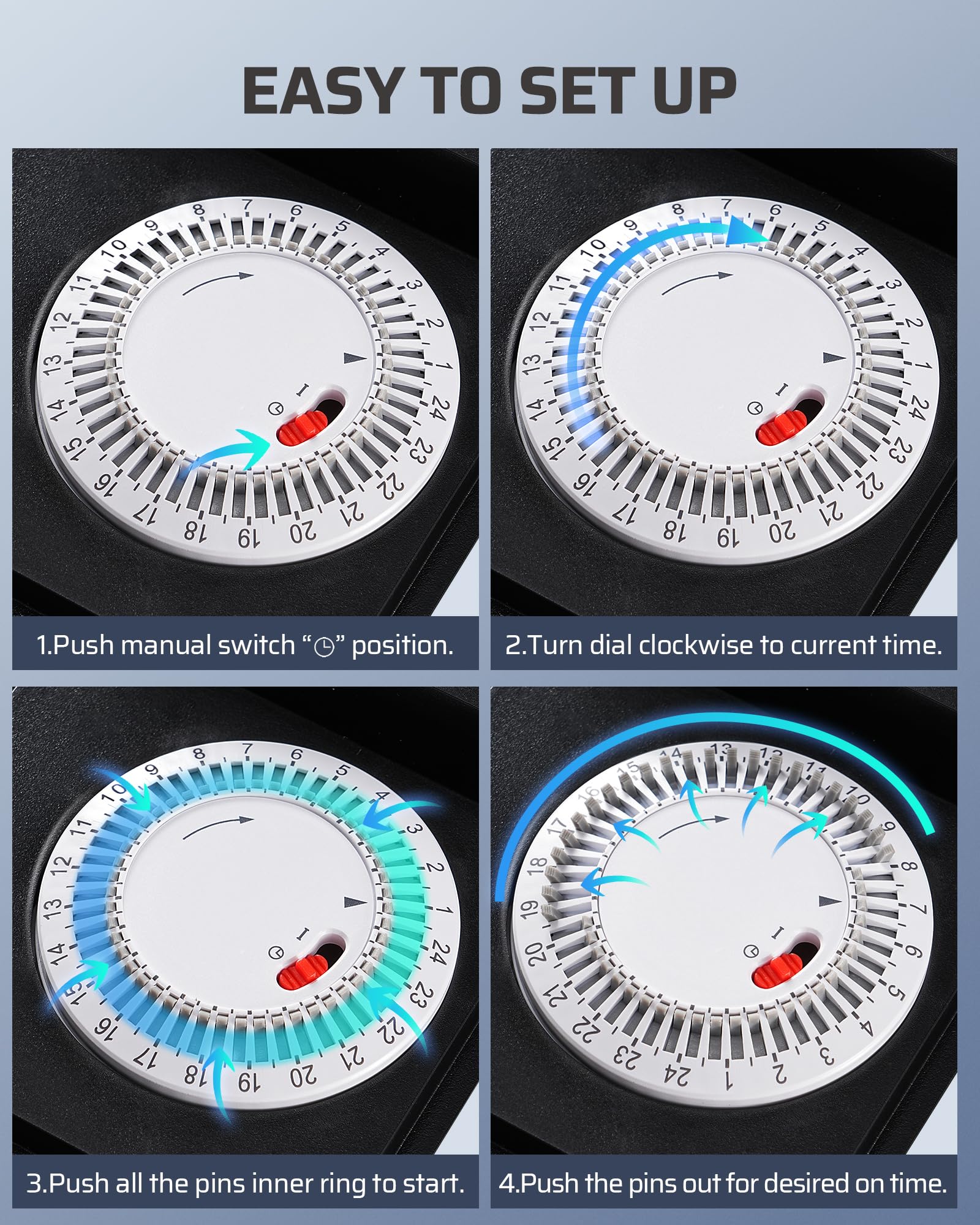 • 【Simple to Set】Up to 48 On/Off settings within 24-hour period, program your devices to turn on/off in 30-minute intervals, repeat daily; or override the timer to always ON mode by push the manual switch to 'I' position