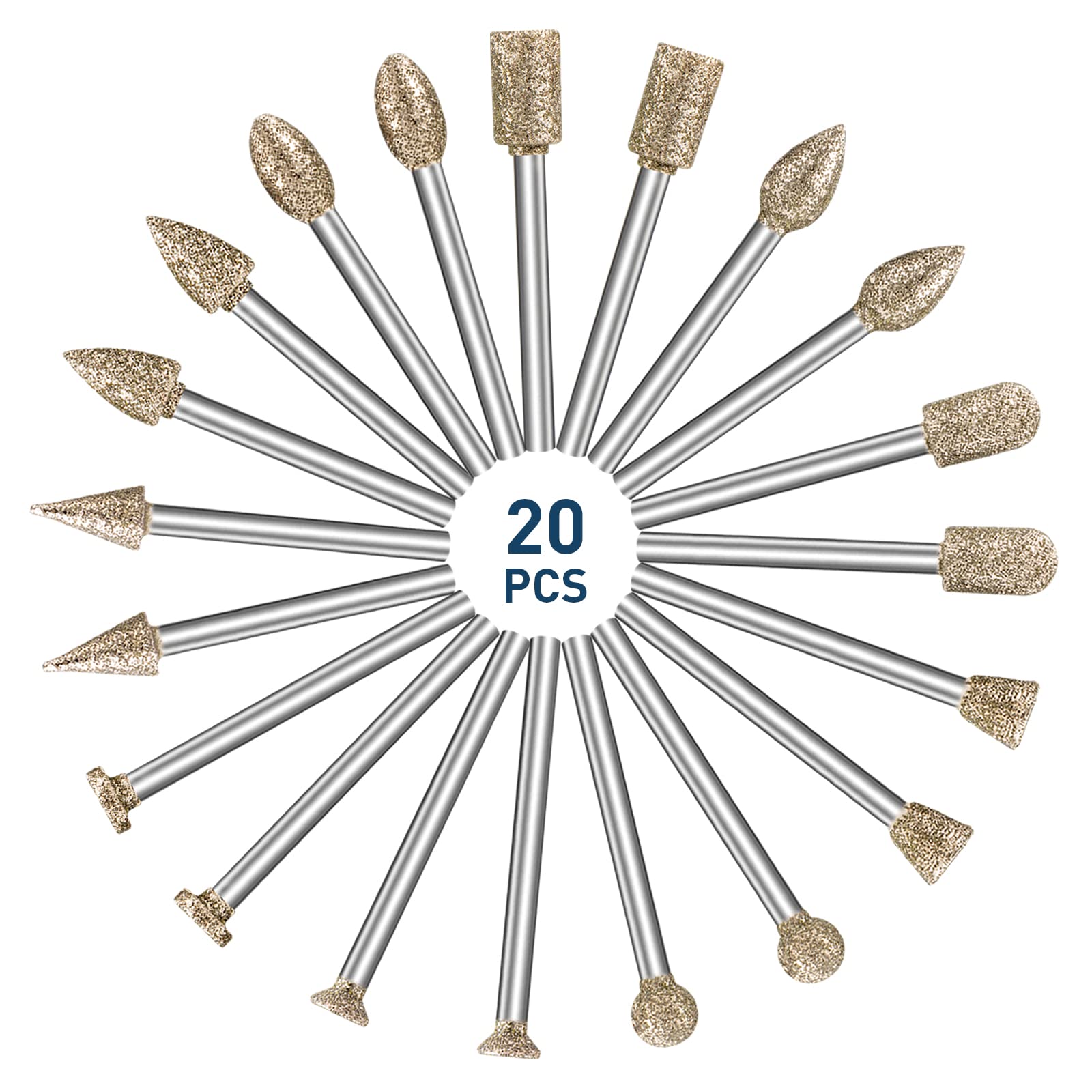 Diamond Grinding Burr Bit Set,20Pcs Rotary Tool Accessories Stone Carving Set with 1/8 inch Shank for Stone Ceramic Glass Carving, Grinding, Polishing, Engraving, Sanding