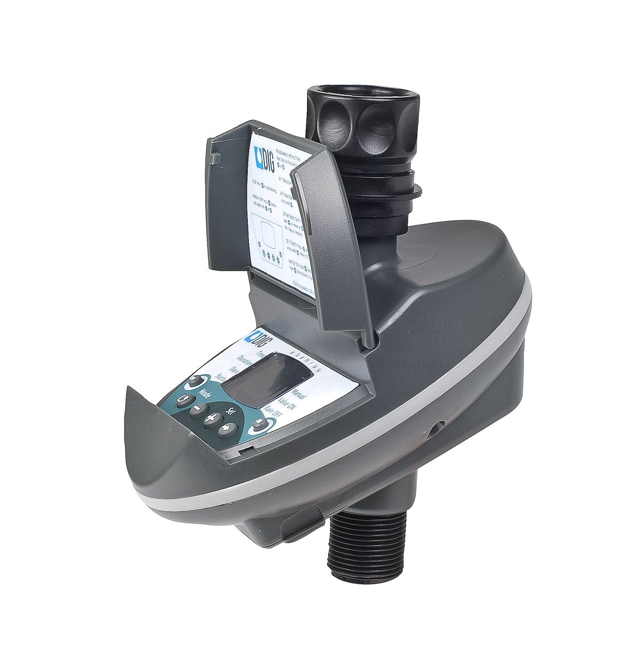Details: DIG Corp. Model 9001DB 3/4' Hose end battery operated timer with female hose thread inlet and male hose thread outlet, connects to a faucet or hose. Program using six buttons with LCD display for a wide range of irrigation schedules. Up to 4 start times per day, watering duration from one minute to eleven hours and 59 minutes in one-minute increments, low battery indicator and more.
