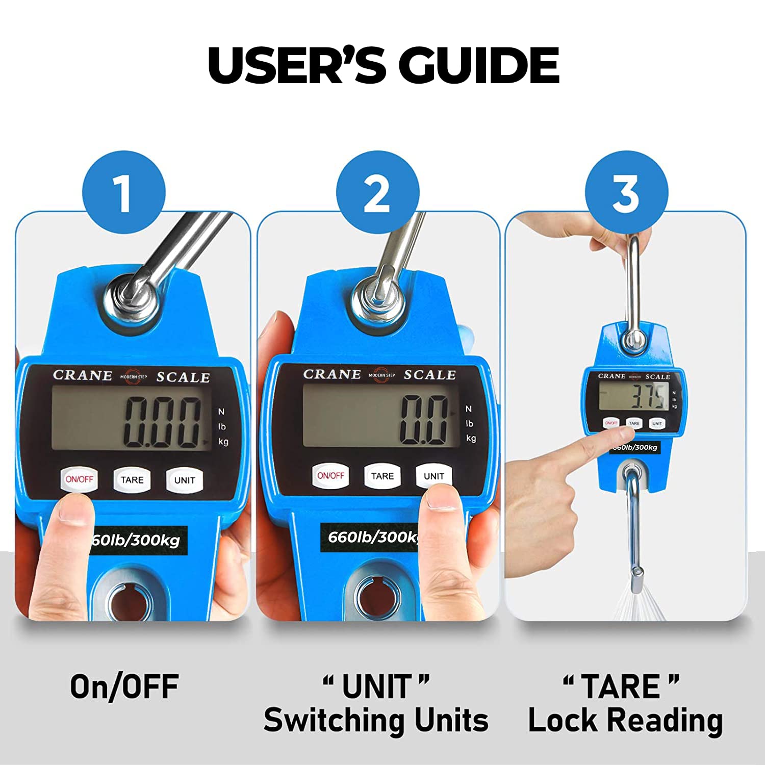 • Easy To Use And Handle: Insert batteries, set up pound - kg, hang the hook. Balance crane scale weights animals - pig, hog, deer, buck, fishes over 50lb, 100lb, 600lb (game animal).