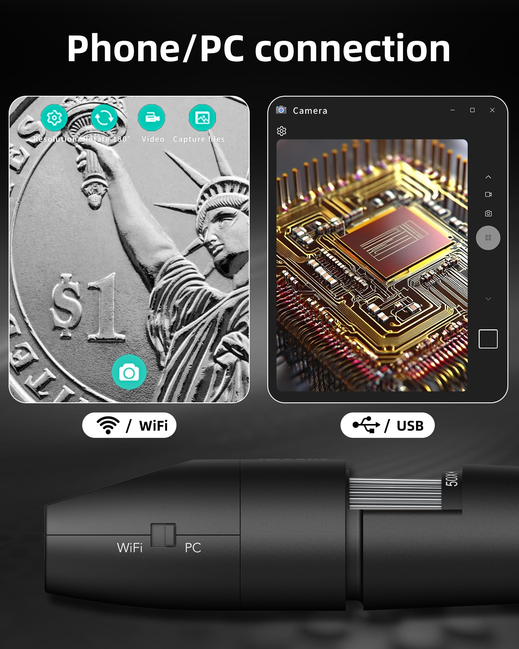 • Wifi & USB Function: App Provided. This cell phone microscope can not only connect to your smartphone via wifi function but also connect to your computer via USB cable. It can be switched as needed, which is more convenient and smarter.